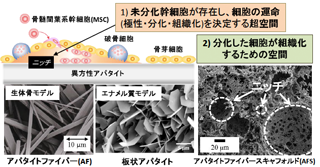 自然界、特に「生物」の世界は「異方性」にあふれている。例えば、ヒトの骨や歯などの硬組織に着目すると、それらの無機成分は「アパタイト」であり、それは体の部位により異なる配向性(異方性)をもっている。本研究では、異なる「異方性アパタイト」を用いて、細胞の運命(極性・分化・組織化)を決定づける「ニッチ」を再現する「異方性生命機能マテリアル」の創製プロセスを開発するとともに、「間葉系幹細胞(MSC)」の分化スイッチのON/OFF状態を解析することにより、構築したニッチ空間の機能を検証している。なお、異方性アパタイトとは、我々が世界に先駆けて合成に成功している「アパタイト単結晶ファイバー」や「板状アパタイト単結晶粒子」のことを示している。
