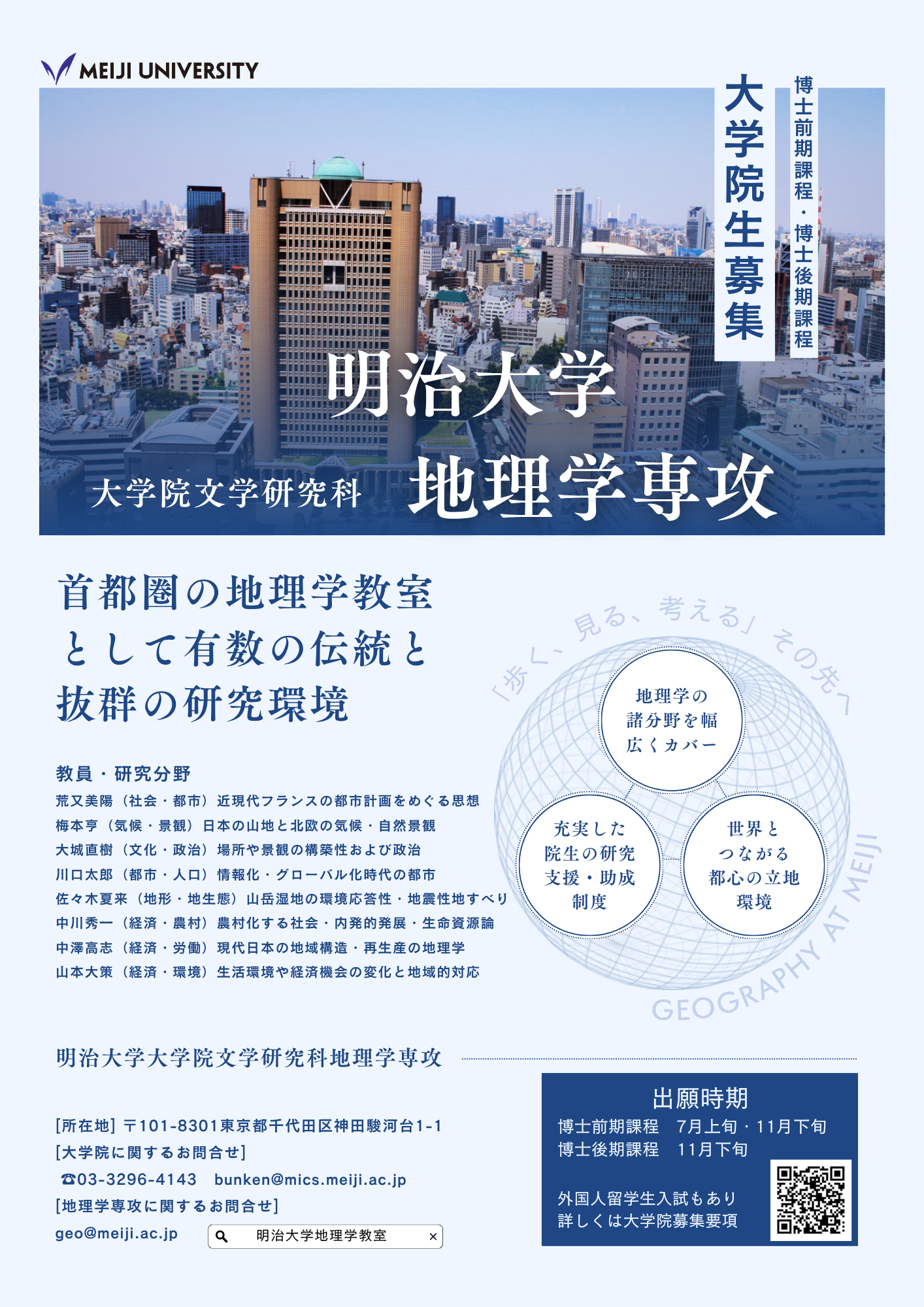 明治大学文学部 史学地理学科地理学専攻 明治大学大学院文学研究科 地理学専攻 〒101-8301 東京都千代田区神田駿河台1-1 TEL 03-3296-4545(大学代表) 教室へのご意見・ご質問は メールにてお寄せください。geo@meiji.ac.jp