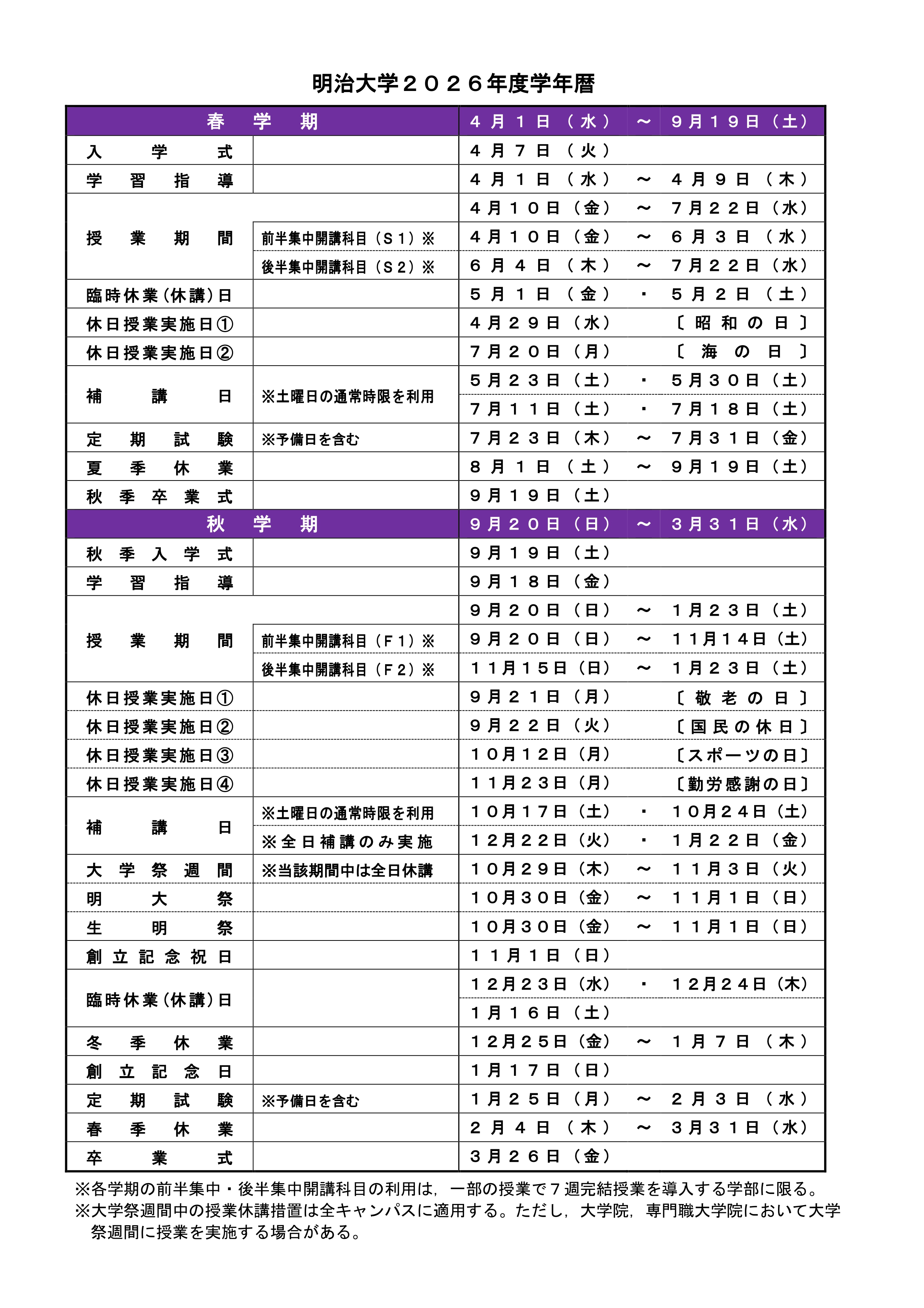 | 1限 9:00-10:40 | 2限 10:50-12:30 | 昼休み 12:30- 1:30 | 3限 1:30- 3:10 | 4限 3:20-5:00 | 5限 5:10-6:50 | 6限 7:00-8:40 | |
