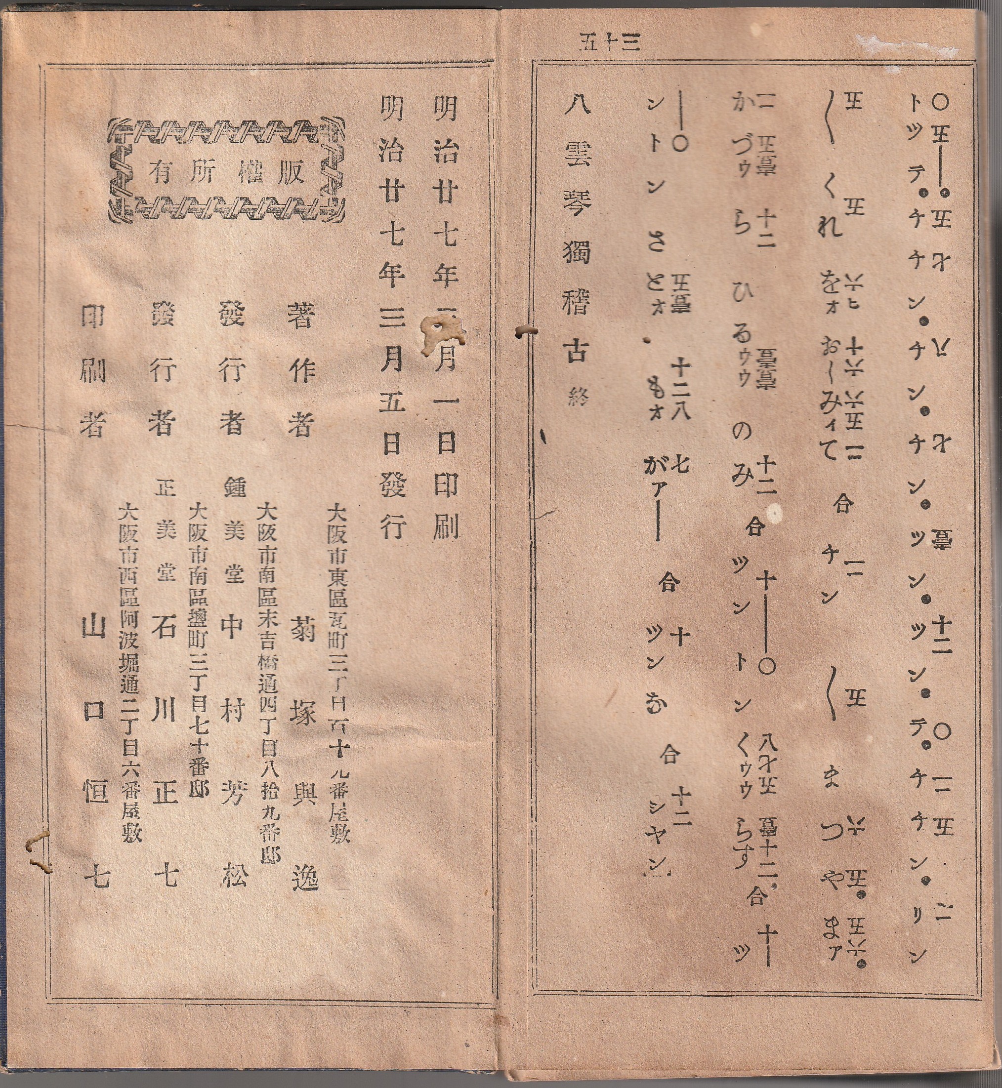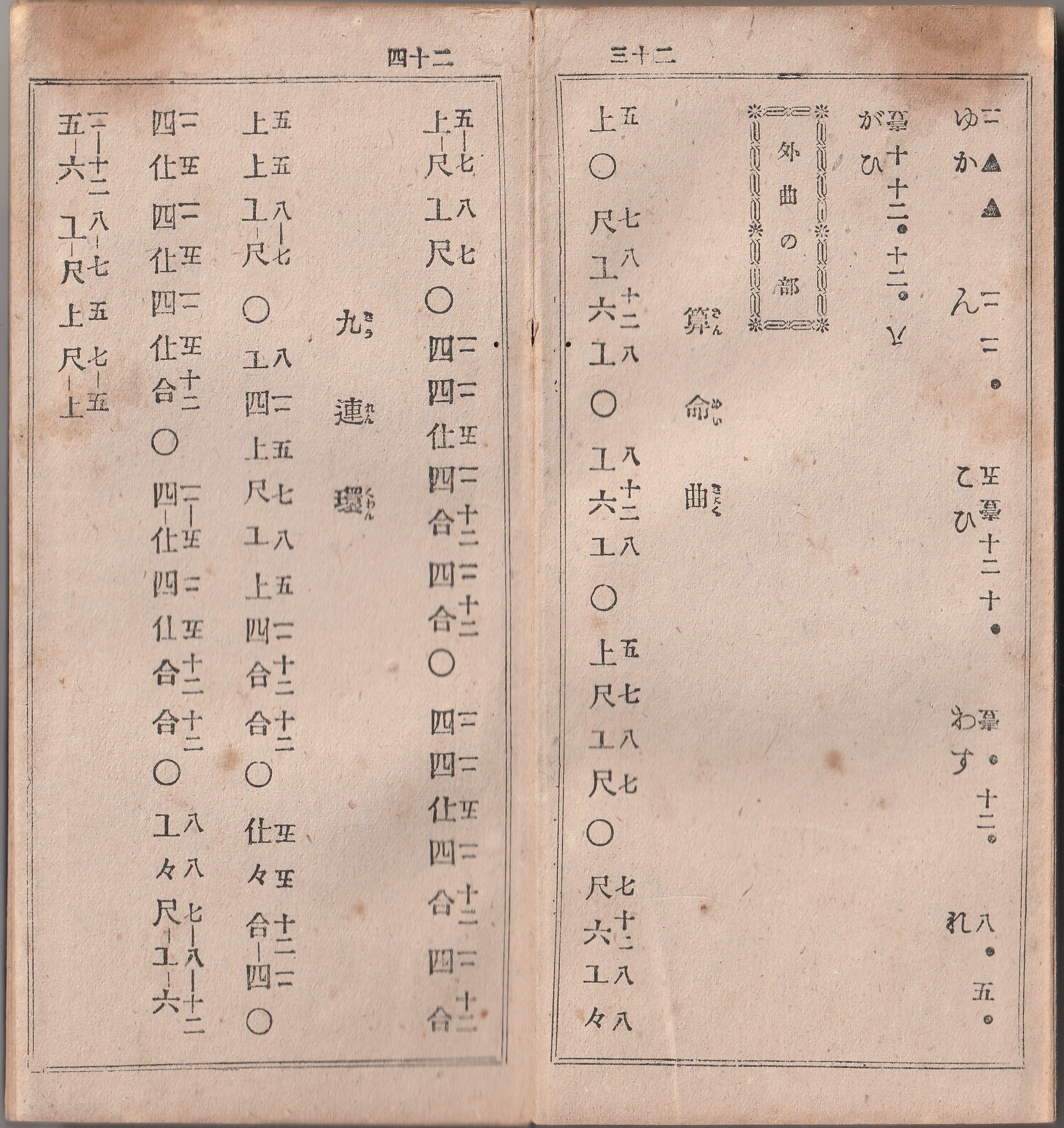 清楽曲譜(1893) 沖野勝芳編 高田:洋々館,明26.6 清楽は、明治27年に日清戦争が勃発すると「敵性音楽」視され、一時、下火になる。 本楽譜本は、その直前に出版された清楽譜本である。明治中期の工尺譜本なので、各音符の長さも記されている。 |