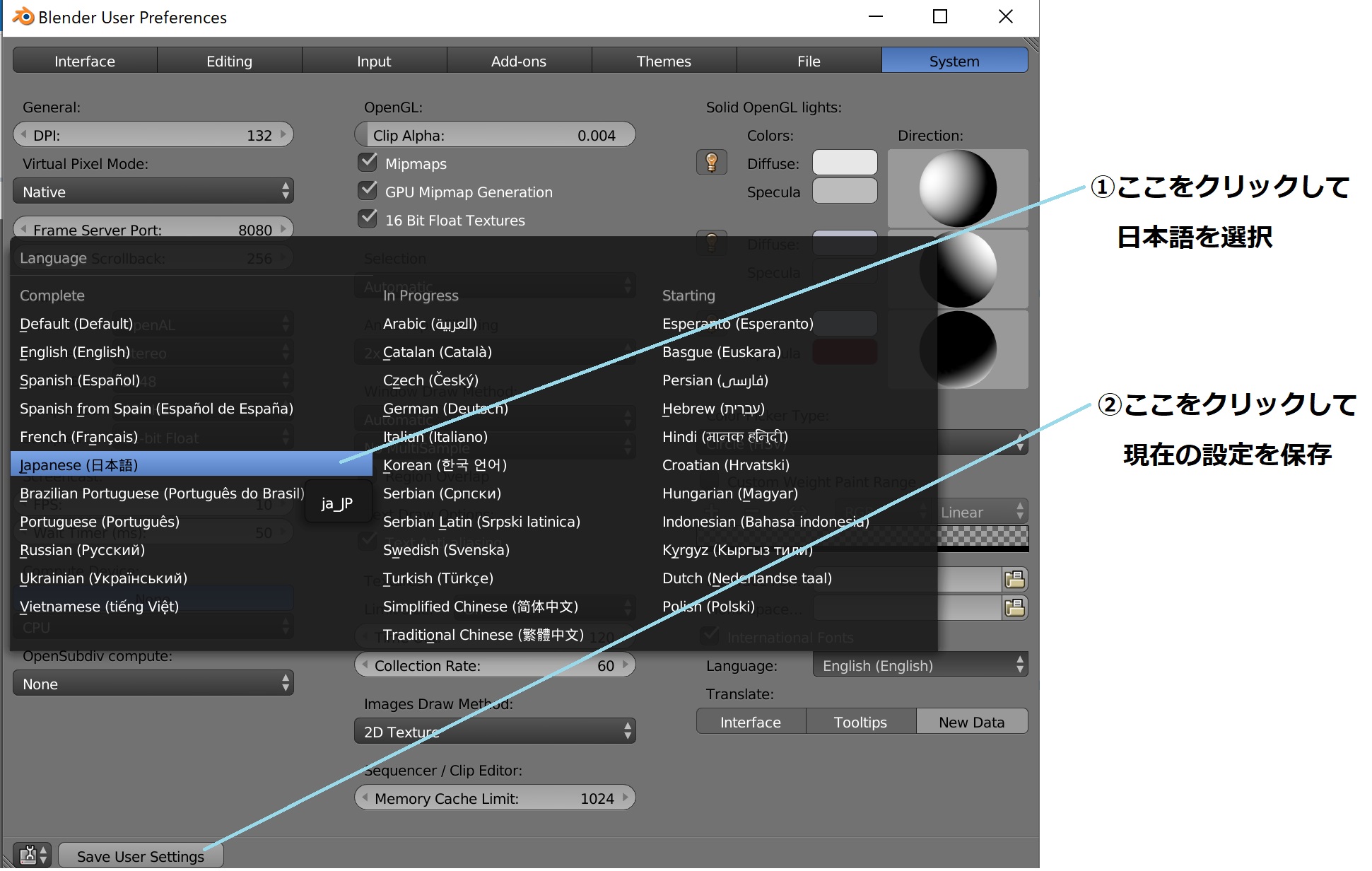 ◆表示される言語フォントから Japanese(日本語) をし、最後に左下の Save User Settings をクリックします。これで、以降、メニュー等の表示が日本語になります。同様にして別な言語表示にも変更できます。