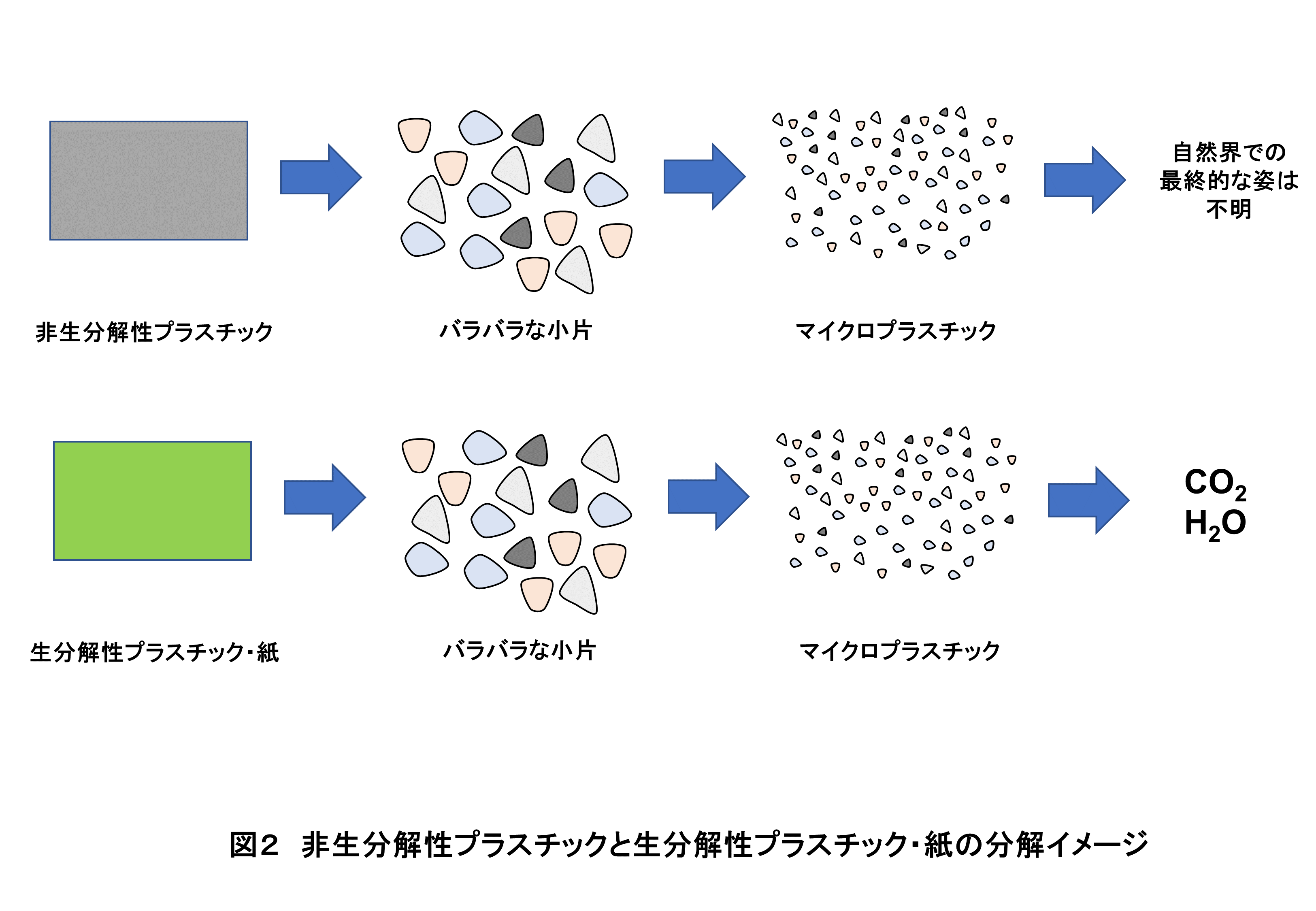 生分解性プラスチックは、生分解性により最終的にCO2とH2Oに分解されるため固体分が無くなり、ごみの最終処分場(埋立地)の寿命を延ばすために有効です。生分解性は微生物の働きによるものであり、一瞬でCO2とH2Oになるわけではありません。生分解性の無いプラスチックと同じく、元の製品がバラバラになり、さらに小片から微粒子化してから、最終的にCO2とH2Oになります(図2参照)。つまり、生分解の過程でも、マイクロプラスチックの形を経ていくのですが、生分解は継続して進行するため、マイクロプラスチックとして長期にわたって残留することはないとして、マイクロプラスチック問題の対応策の一つとなることが期待されています。