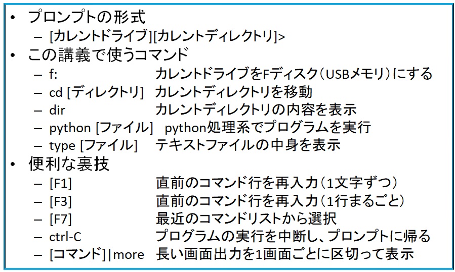 つまり皆さんは、毎回の講座のはじめに、スタートメニューからコマンドプロンプトを立ち上げ、その画面で、