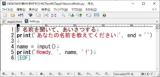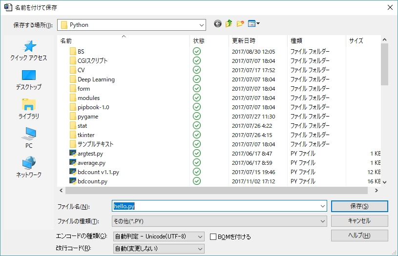 「秀丸」などのテキストエディタでそのまま保存すると日本語(Shift-JIS)になるが、python3.xでは、日本語を含むすべての文字をUnicode(UTF-8)で扱う規定になっているので、それに合わせた指定が必要である※5。一度指定して保存すれば、上書き保存の時には気にしなくともよい。この指定は初心者が忘れがちなところなので、新たなプログラムを入力し、保存する時には常に気をつけなくてはならない。