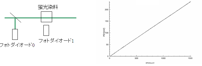 蛍光強度をCCDカメラで計測するときは、CCDカメラの出力がカメラへの入射光強度に比例することが求められる。しかし、なかなかそうはいかないことが多い。下図は、レーザ光強度(横軸)と蛍光(縦軸)をフォトダイオードで計測した場合であるが、両者は線形関係にある。