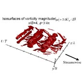 Further downstream, x/B54, the chain-link-fence structures were broken into turbulence and exhibited more a complicated vorticity field, as shown in Fig. 4. However, the lambda-type vortices were still observed in some part of the flow. They were further stretched toward the streamwise and transverse direction.