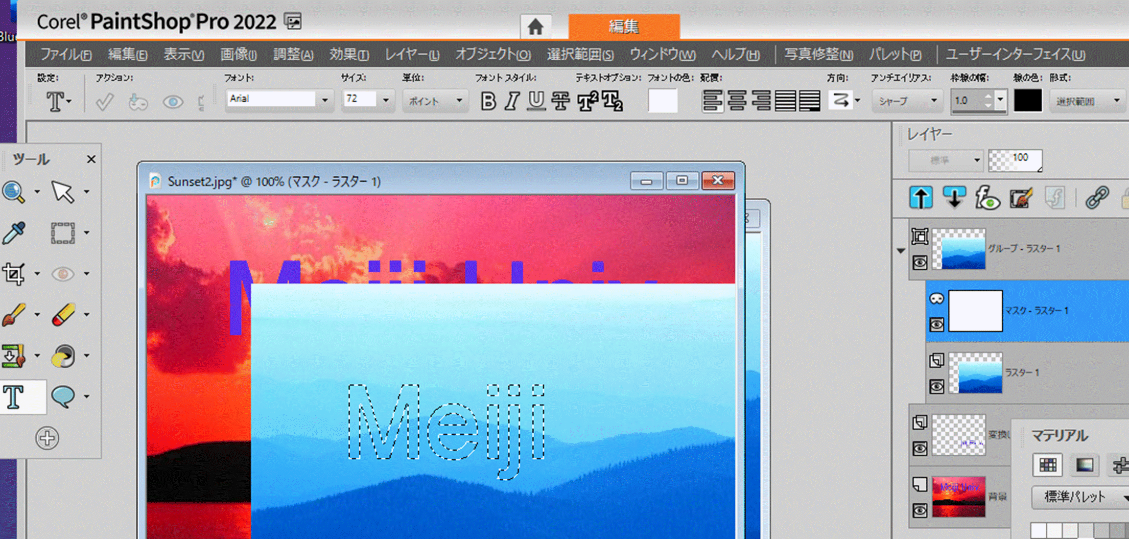 2. 開いた画像のレイヤーパレットにある「背景」と書かれた部分をドラッグし,先ほど,選択範囲で文字入力したSunset2.jpgの画像上に一度カーソルを持っていき、さらにレイヤーの上でドロップする.入力された画像のレイヤーは下の図のように,ラスタ1のレイヤーとしてBlue hills1の画像が背景のSunset2の画像に重なっているようになっていることがわかる.