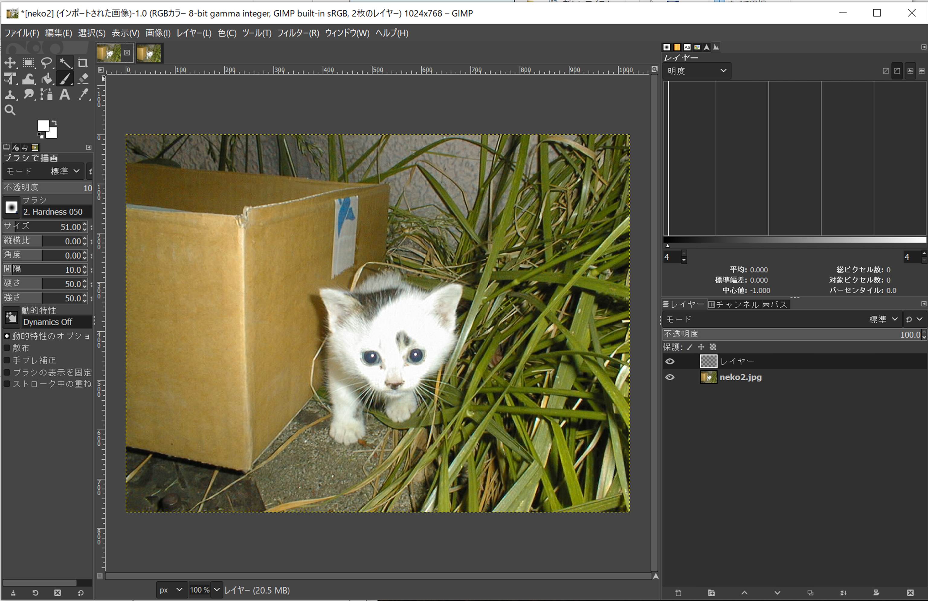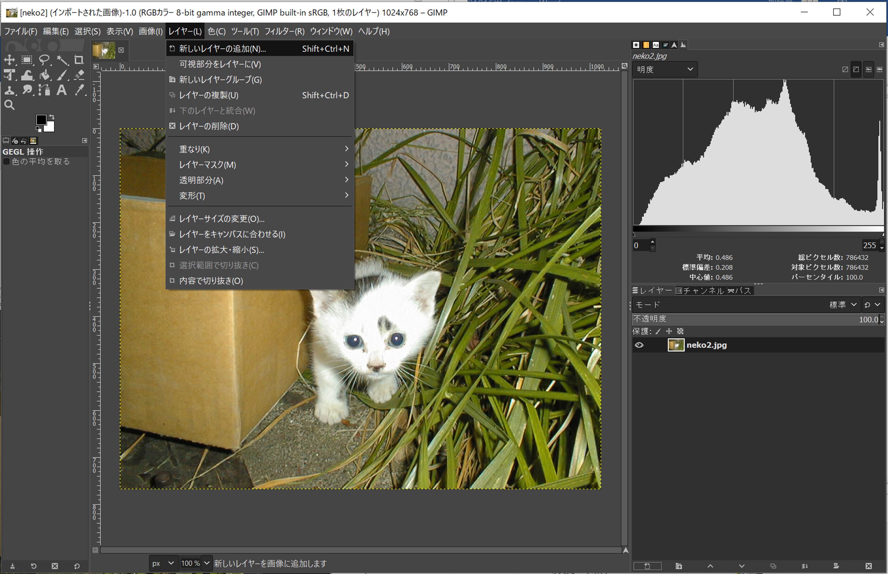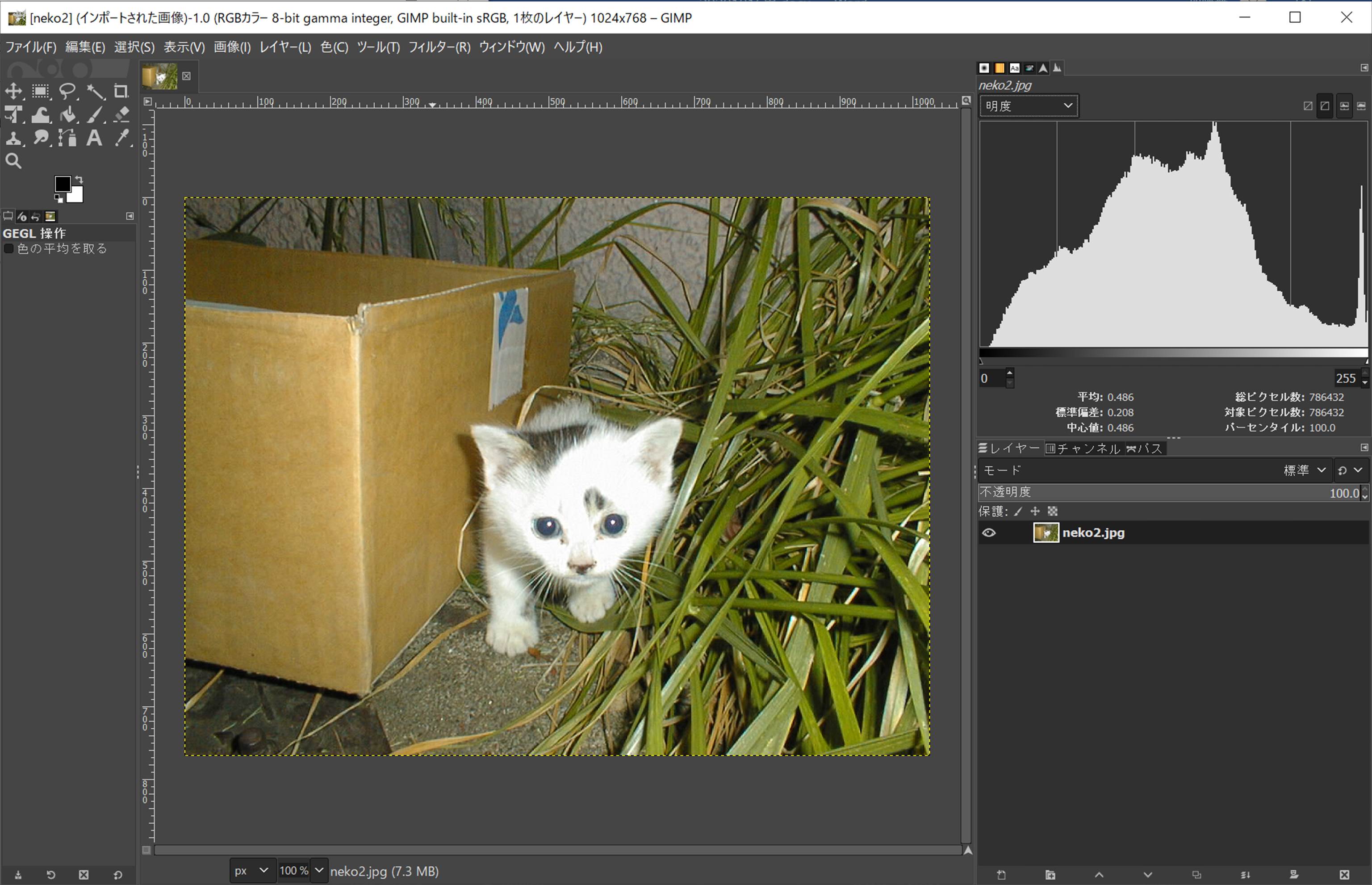neko2.jpg: 1024×768×24bit:169kbyte(画像に使用されているメモリではなく,ファイルの容量)