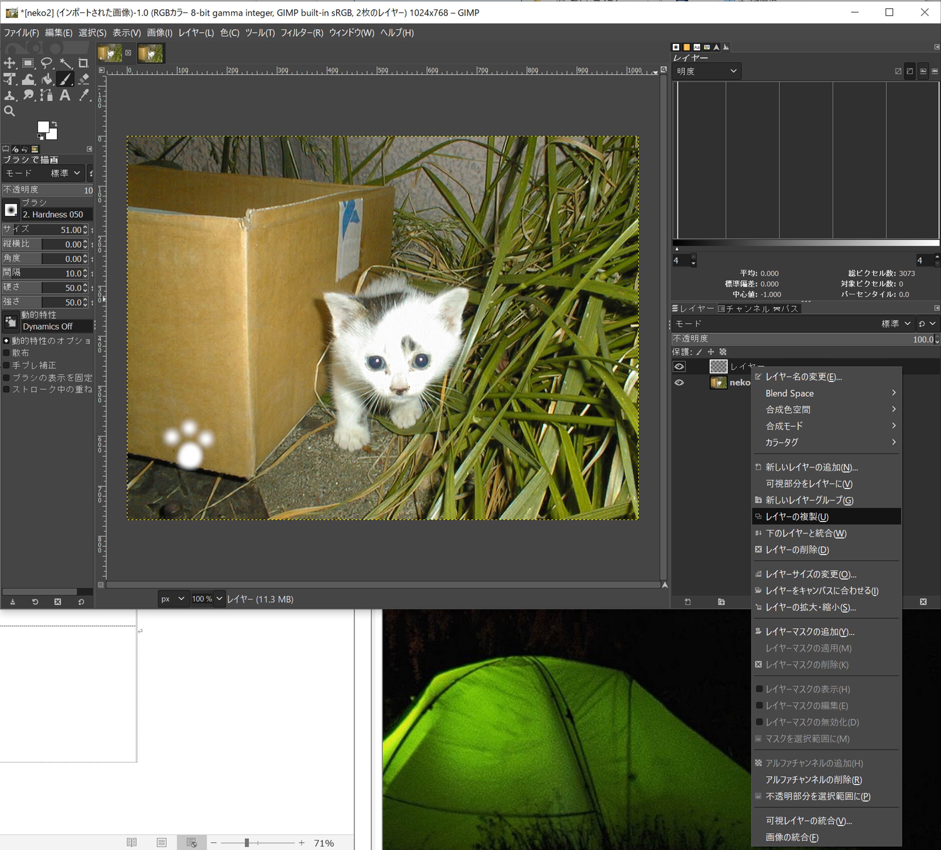 レイヤーを複製するため、複製したいレイヤーの上でマウスの右ボタンを押してプルダウンのメニューを出し、レイヤーの複製を選択します。。 |