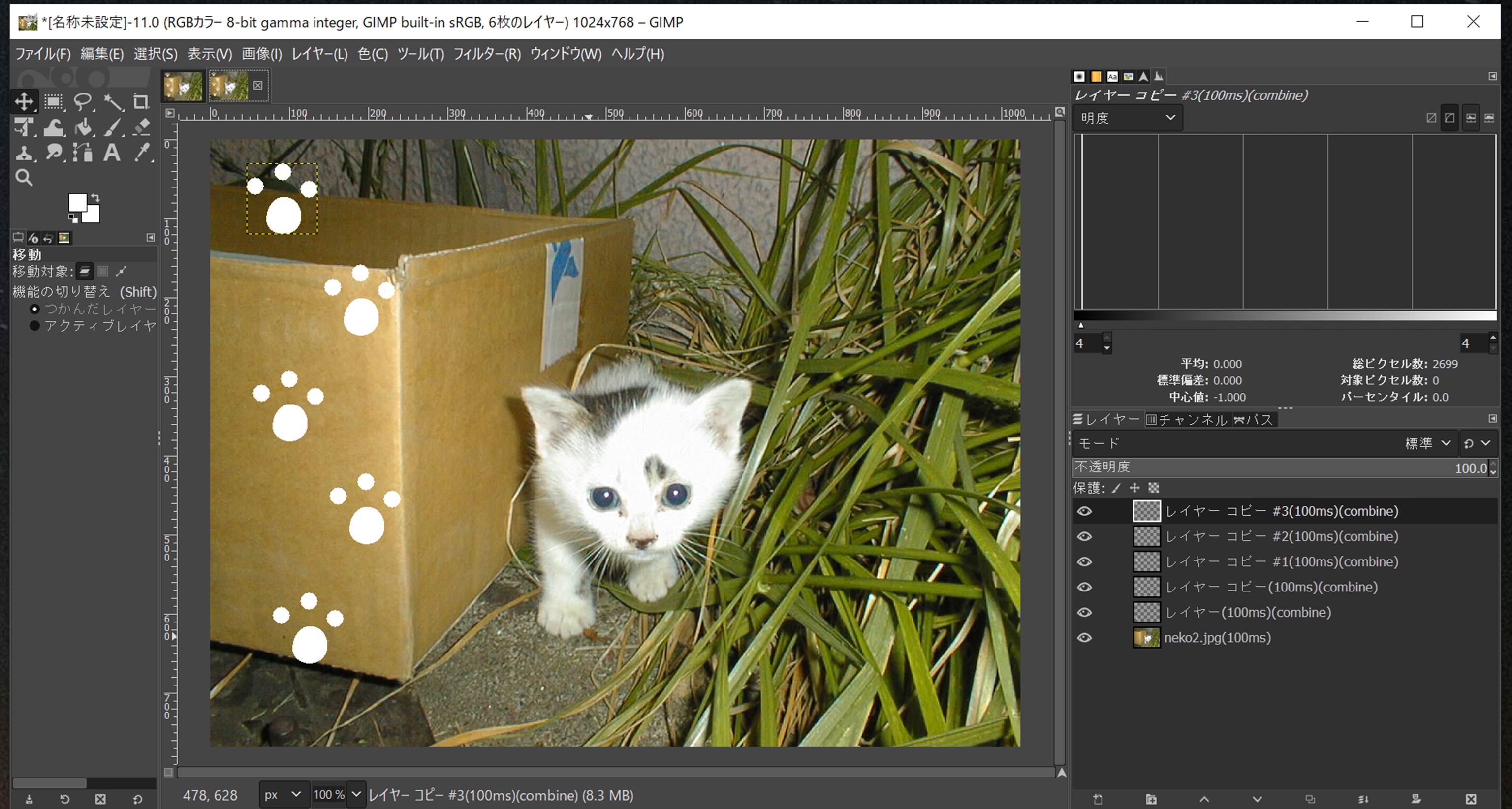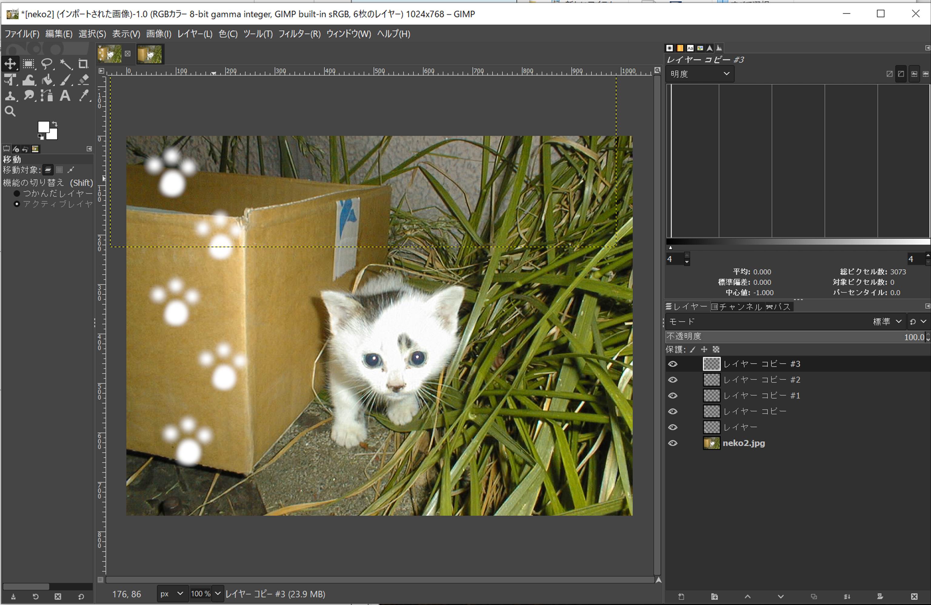 レイヤーの複製と移動を繰り返して行い、足跡を移動させてみてください。