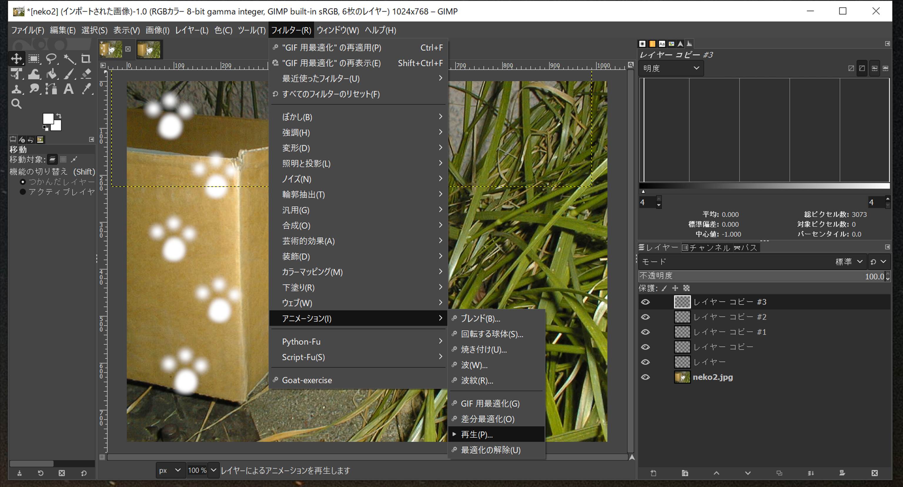 § メニューバーのフィルタの中の「アニメーション」のさらに「再生」を選択します。