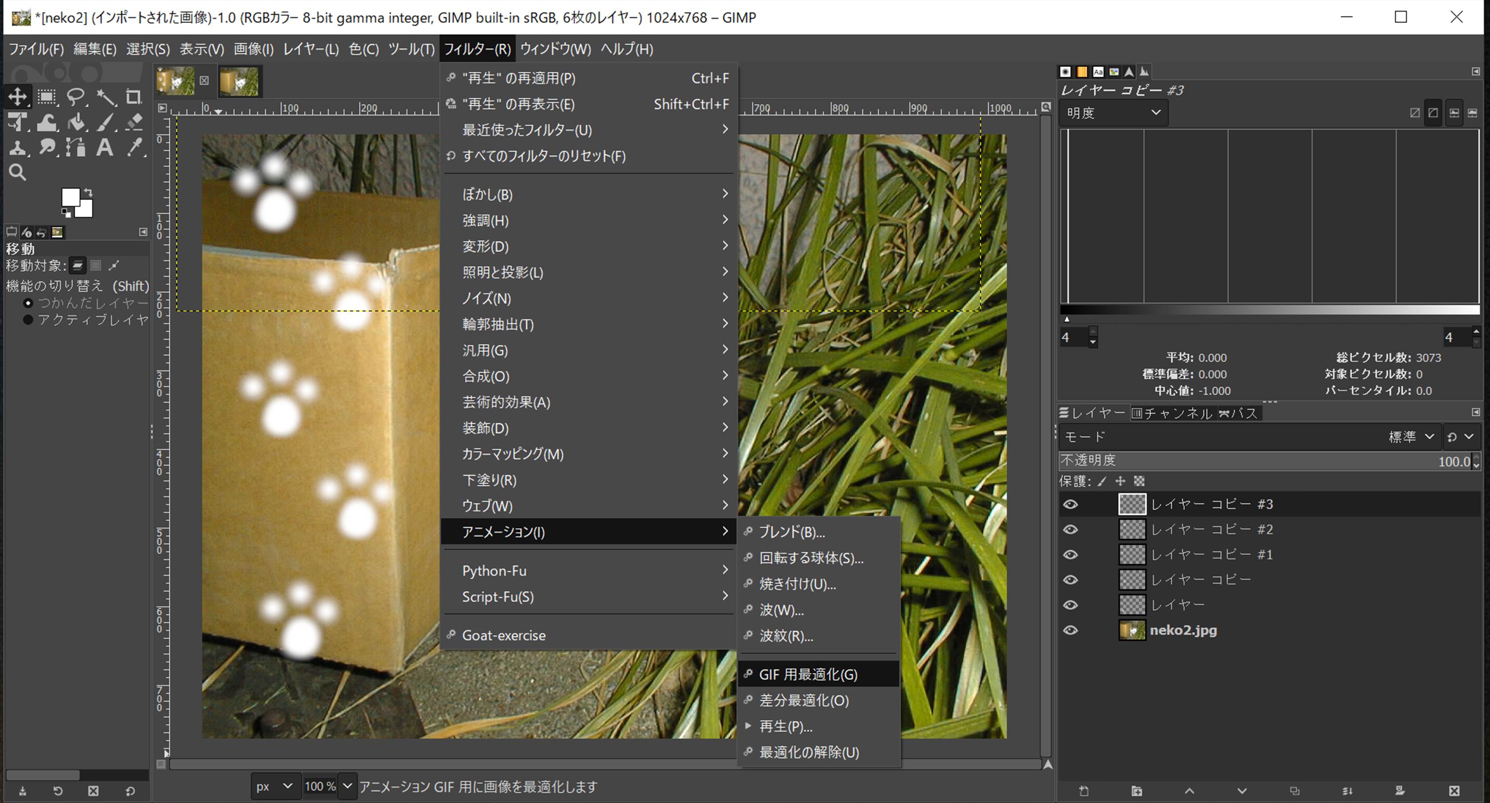 メニューバーのフィルターの「アニメーション」の「GIF用最適化」を行います。