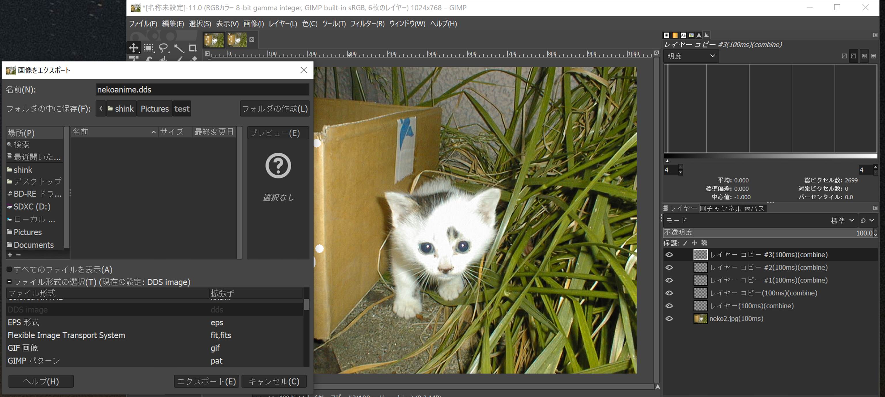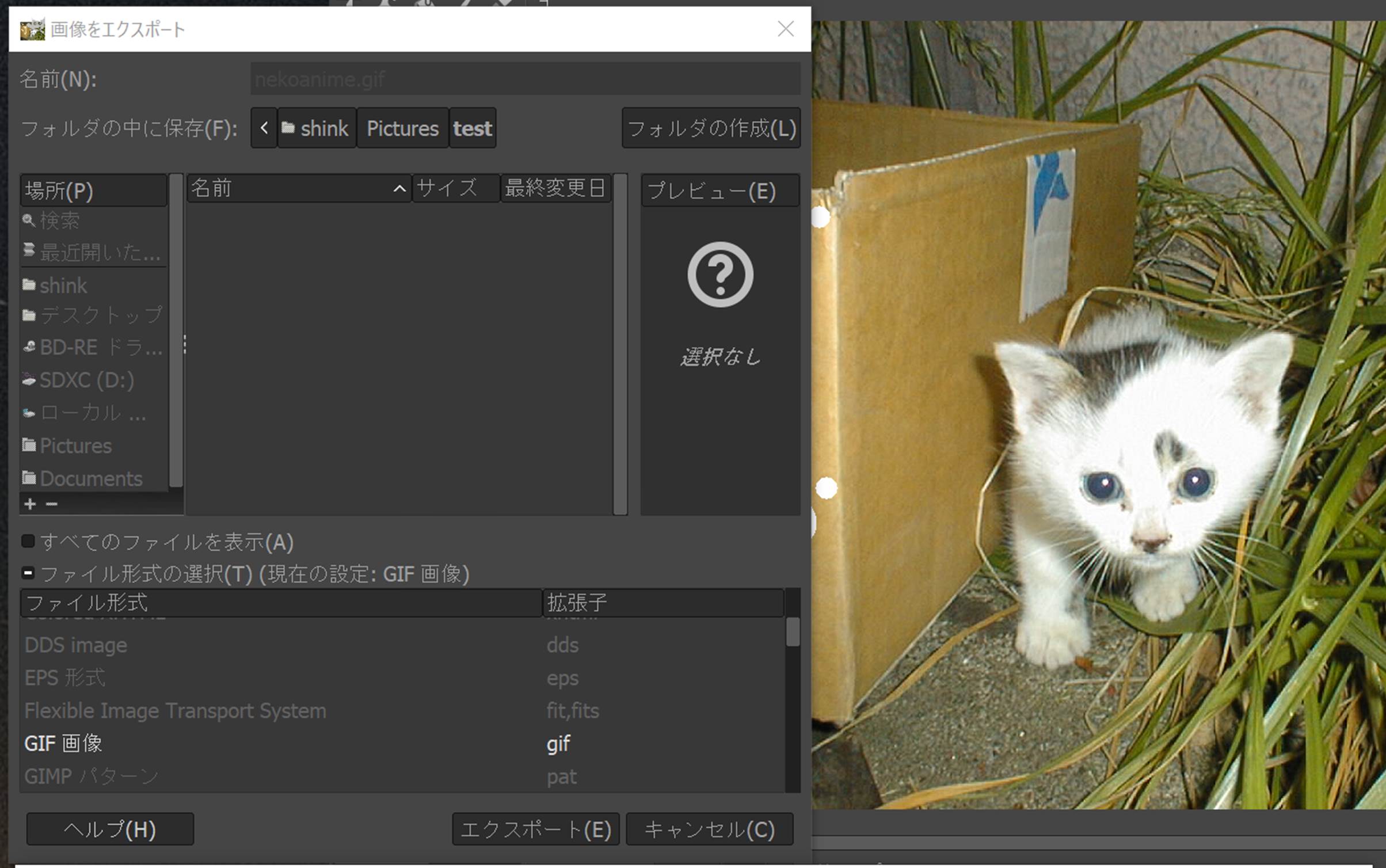 メニューバーのファイルから「名前を付けてエクスポートを選択し、表示されたウインドウ上で保存するフォルダを設定し、下にあるファイル形式の選択で、「GIF画像」を選んで、ファイル名「nekoanimie.gif」としてエクスポートボタンを押します。