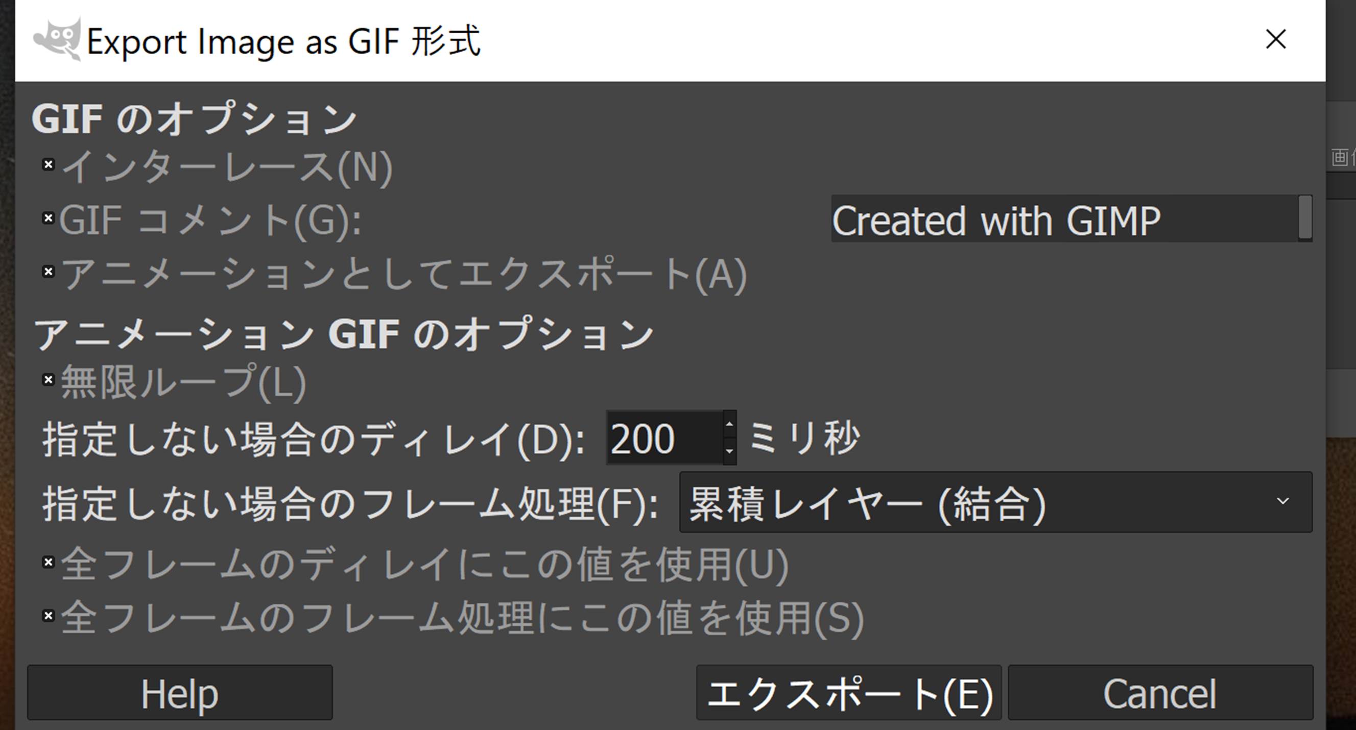 as GIF形式のウインドウで、「アニメーションとしてエクスポート」を選択し、ディレイや全フレームに反映させるかなどを設定し、エクスポートボタンを押して、保存します。