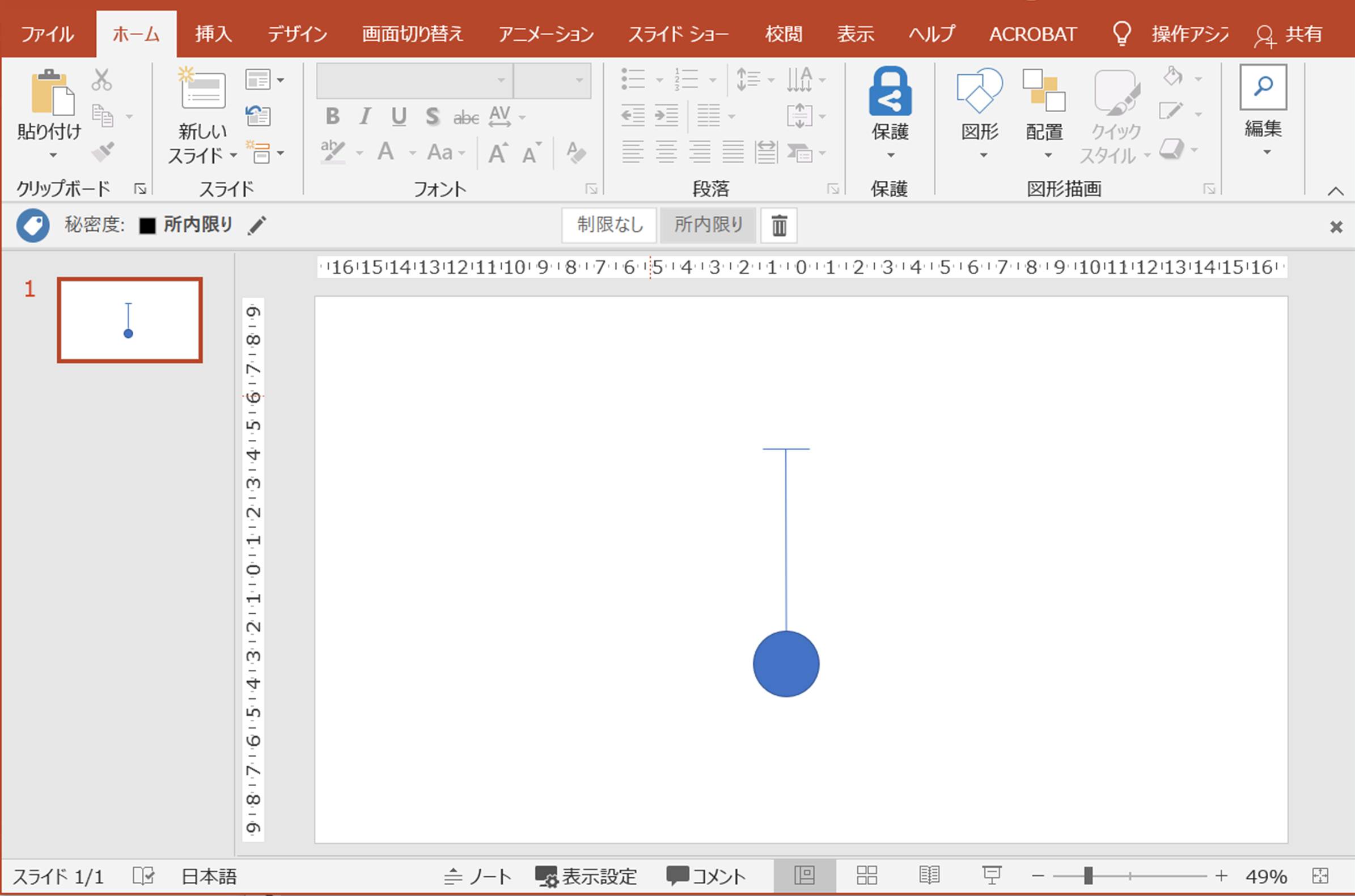 下図のように,メニューバーの挿入から図形を選択し、振り子の絵を描いていきます。簡単4枚のスライドで、左右に振り子が動いている絵を作成します。