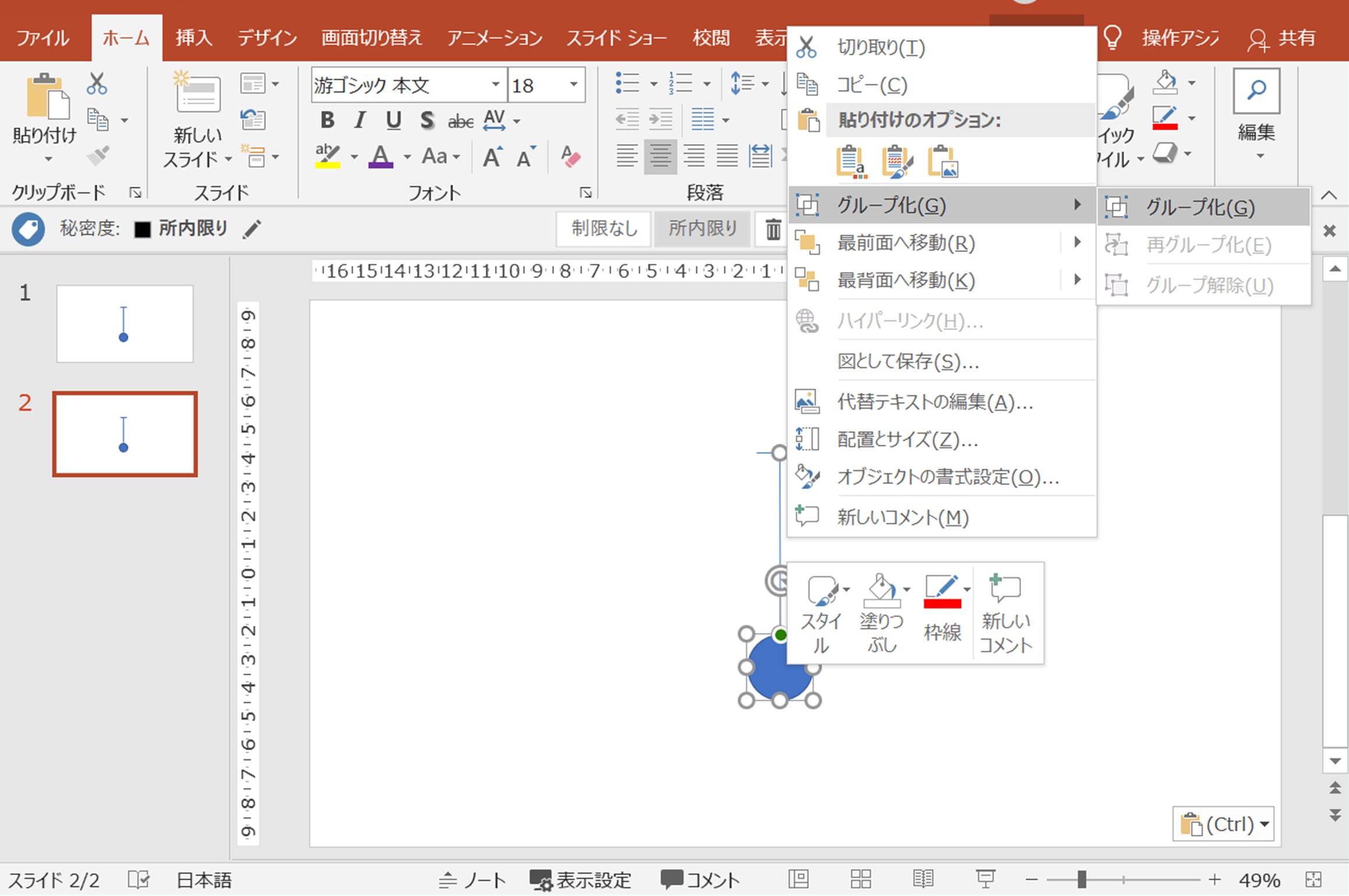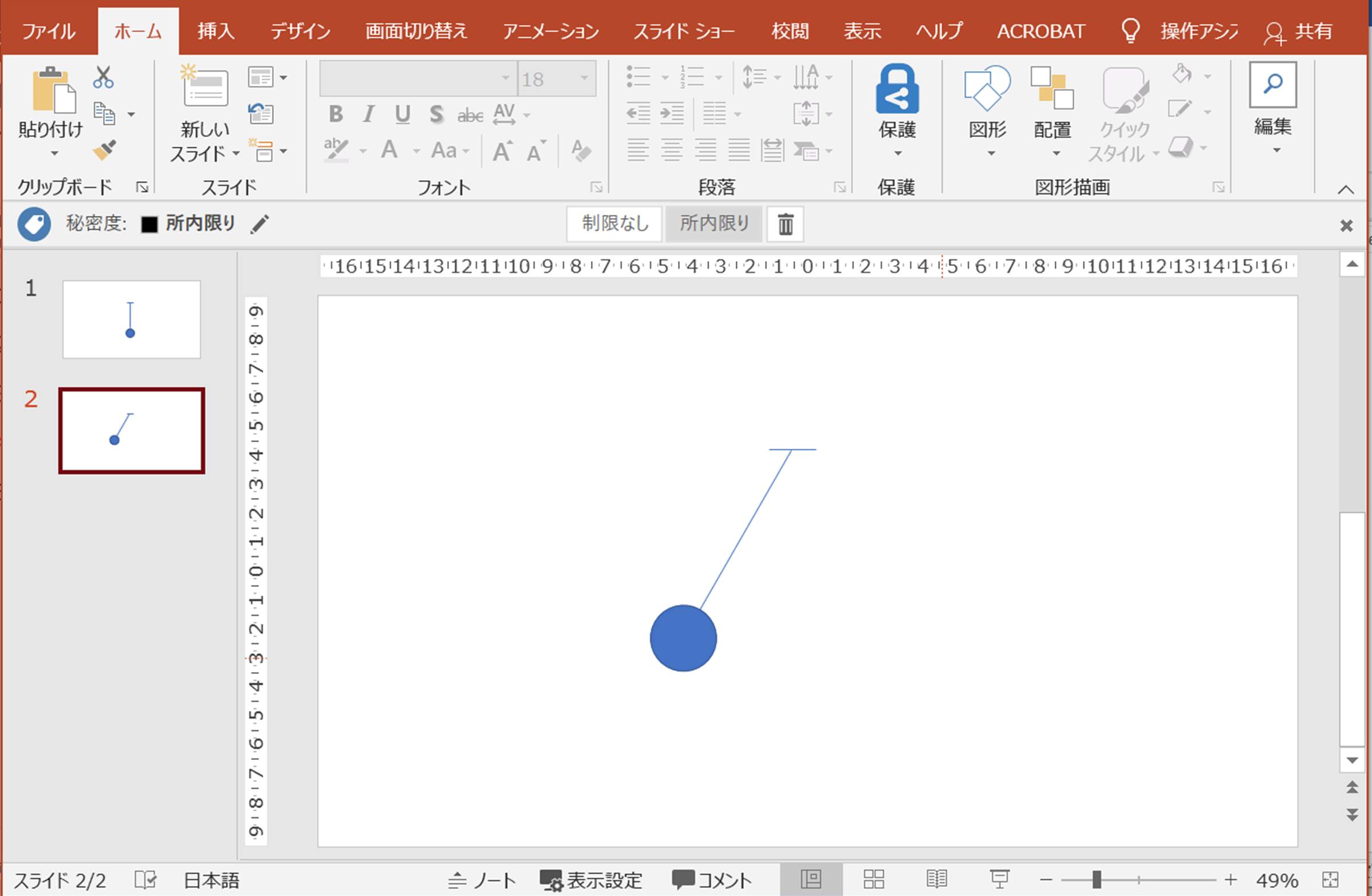 1枚目のスライドをコピーして、2枚目に貼付けし(左側のアウトラインで1枚目を選択し、マウスの右ボタンをクリックし、プルダウンのメニューからコピーを選択し、2枚目に貼りつけします。)、振り子の部分だけ(例の図では上の部分は除き)をグループ化します。