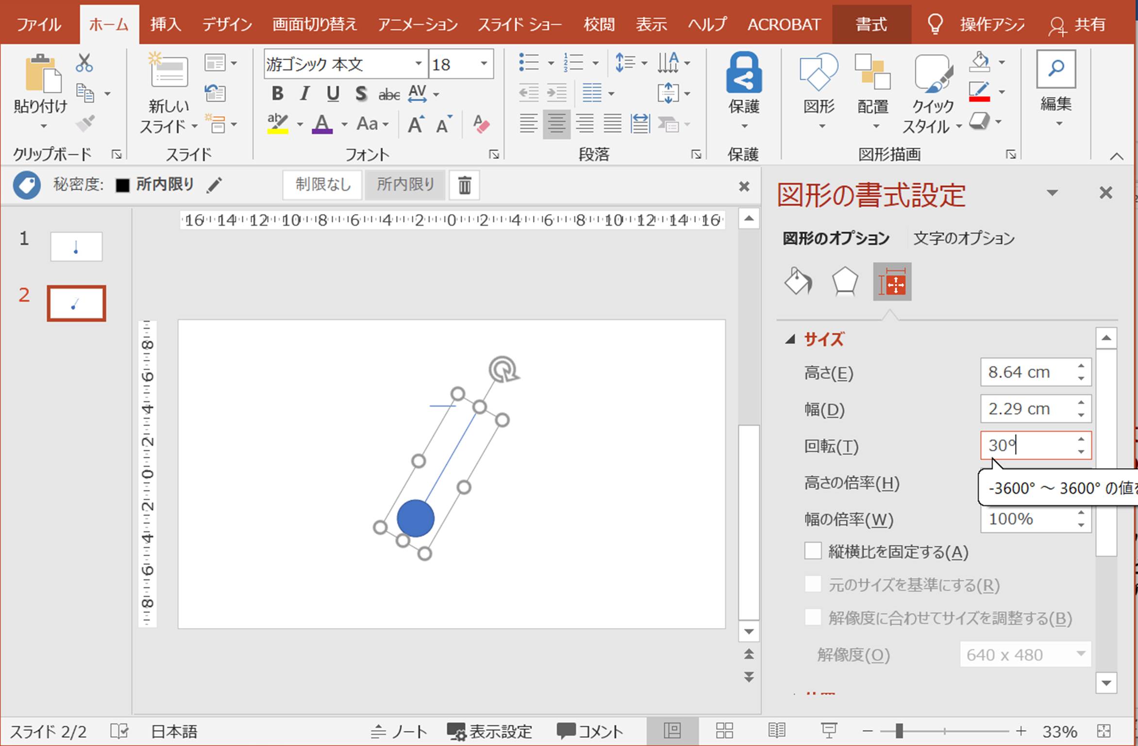 グループ化した部分に対して、図形の書式設定(マウスの右クリックで、図形の書式設定を選択)して、回転で30度を入力します。