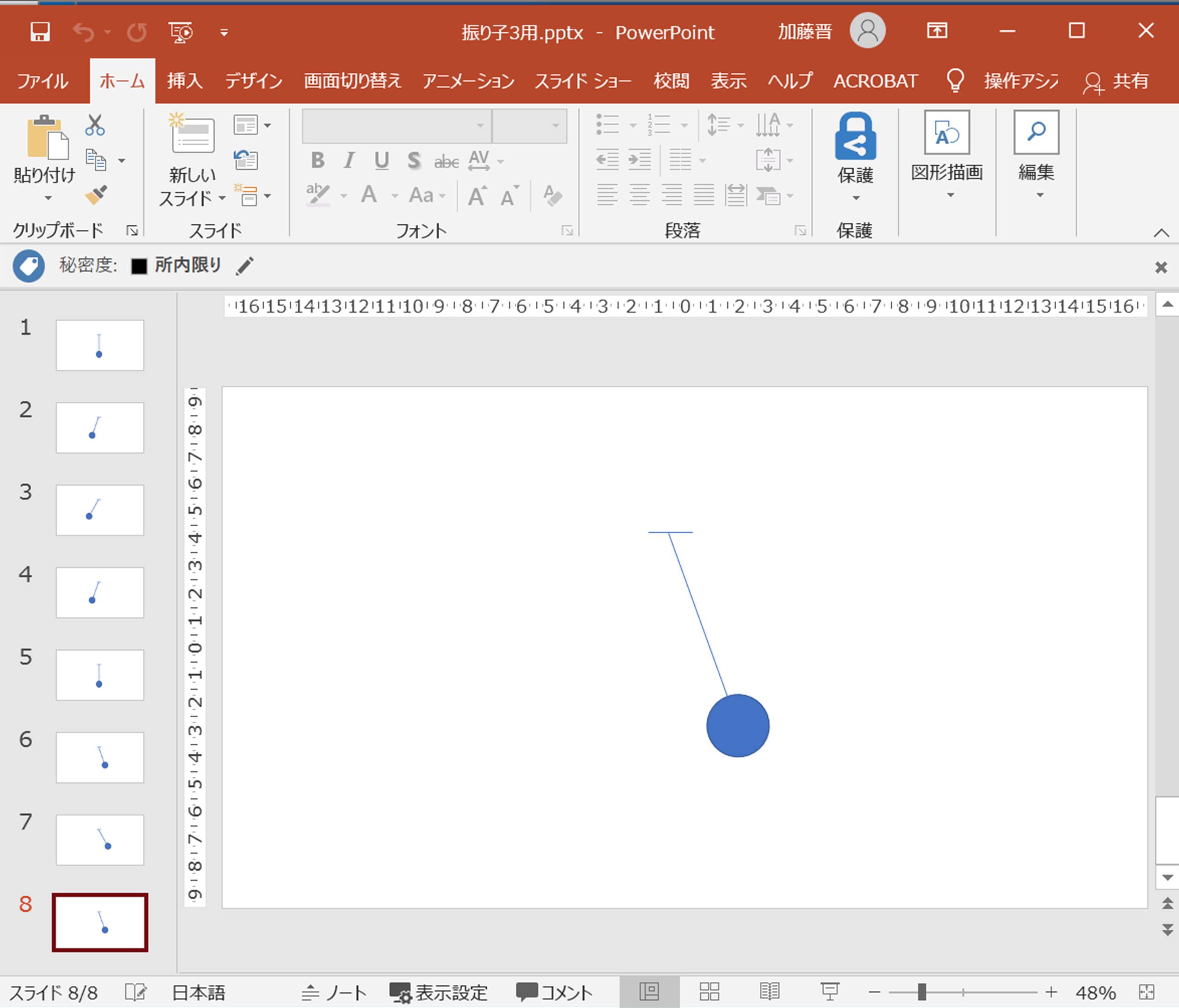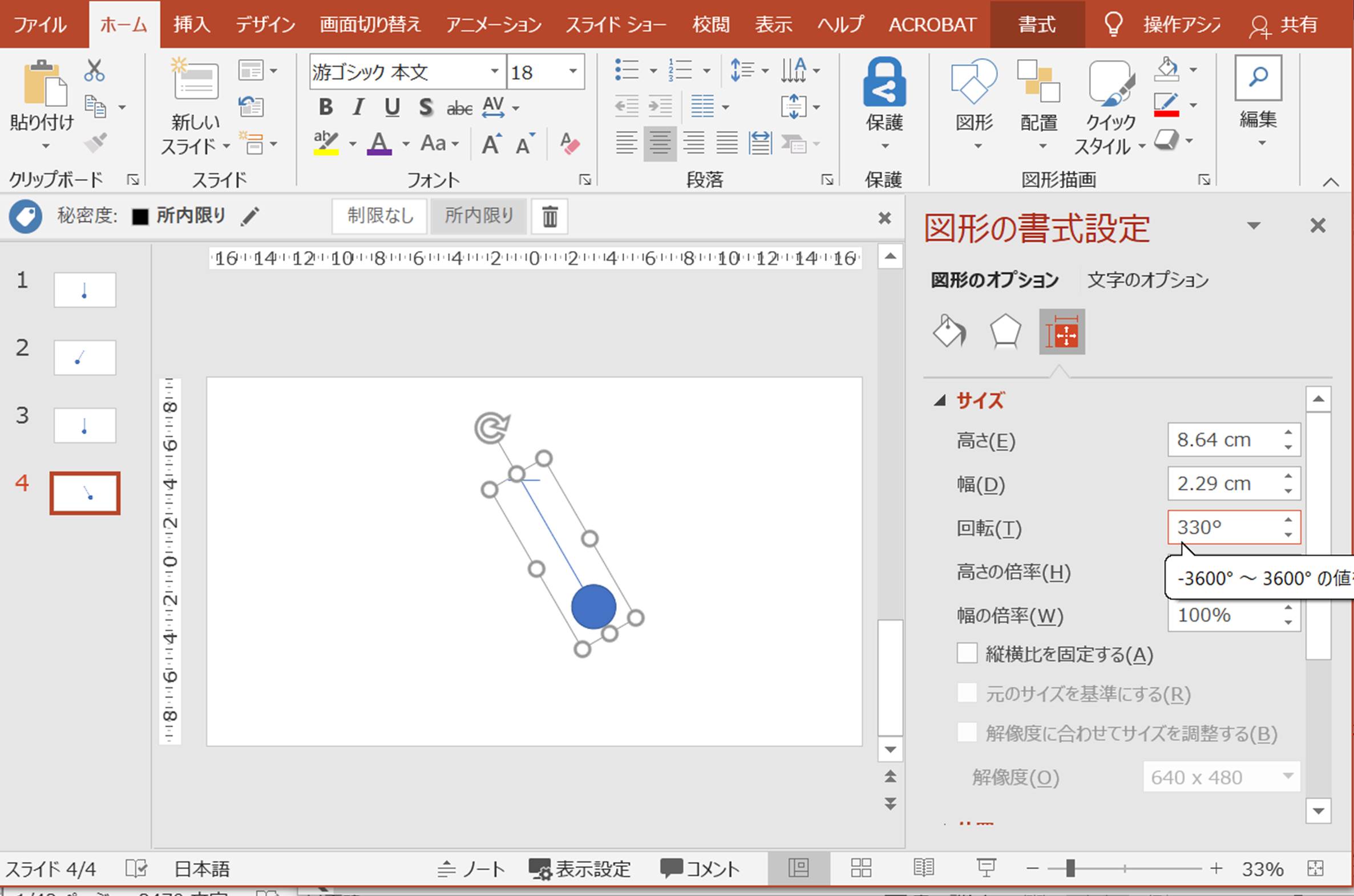 3)4枚のスライドの繰り返しで、振り子が左右に動いている様子になります。これをアニメーションGIFのファイルとして保存することになります。