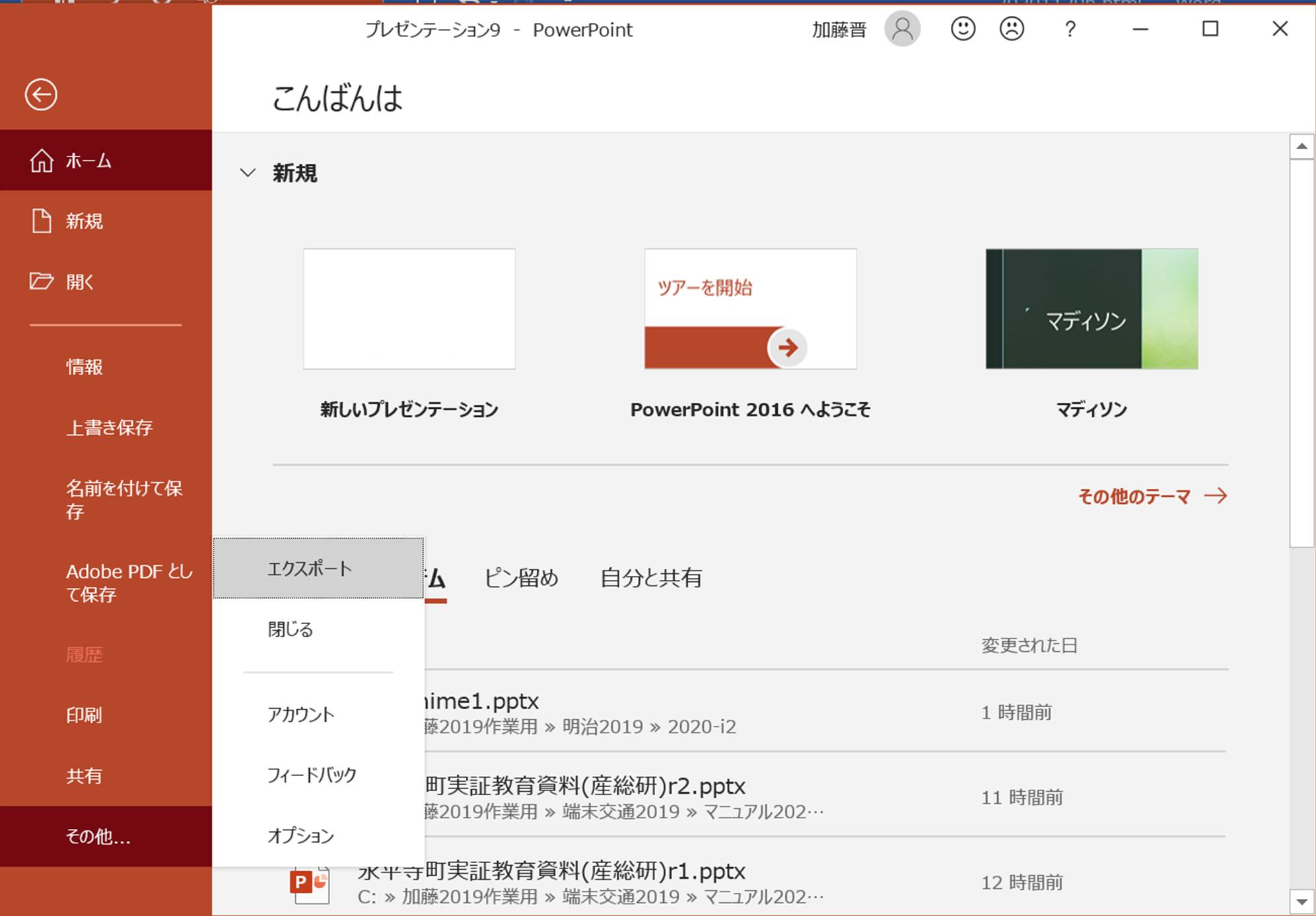 メニューバーのファイルを開き、左のメニューの全体が表示されていれば、「エクスポート」を選択します(全体が表示されていない場合には、以下の図のように「その他」の中にある「エクスポート」を選択します)。