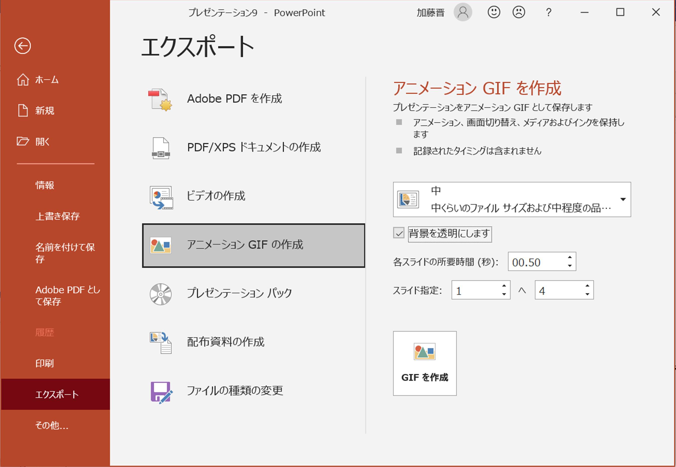 Pointを用いて、スライドを1枚のフレームとして、それらを切り替えるアニメーションGIFファイルを簡単に作成できます。