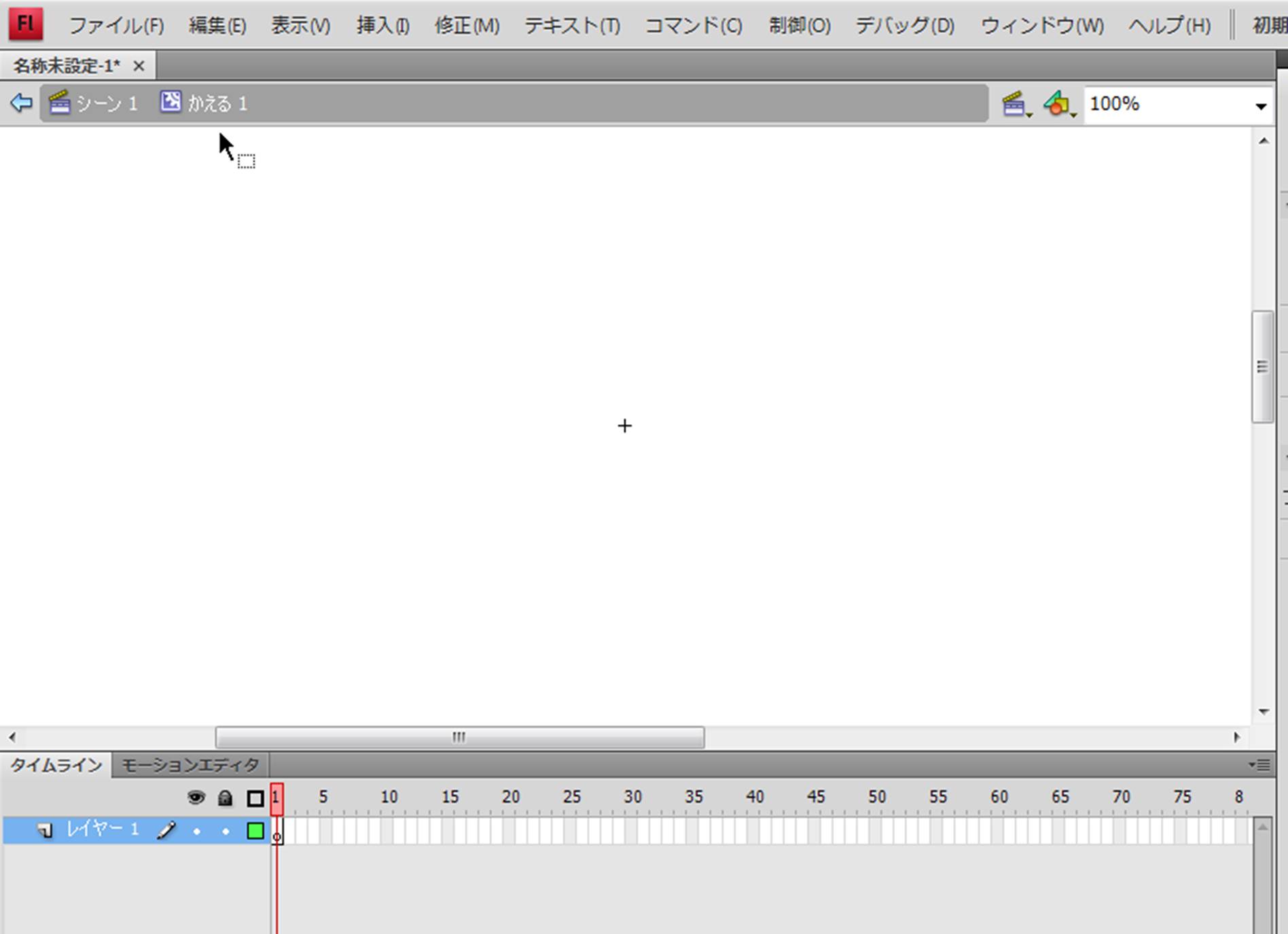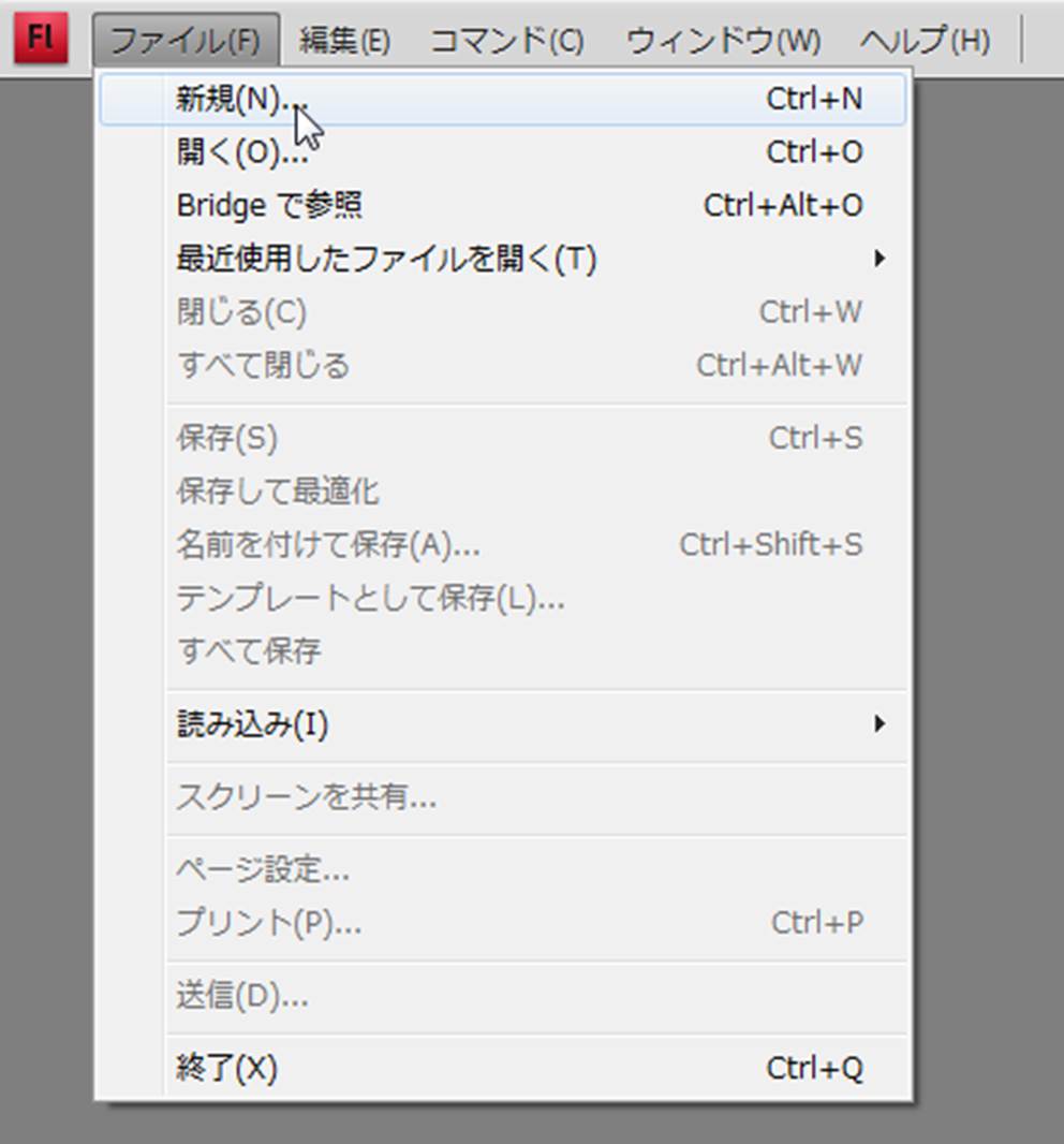 新規にファイルを作成していくため,メニューバーの「ファイル」から「新規」で,Flashファイルを選択し「OK」を押して,あらたなフレームを表示させます.