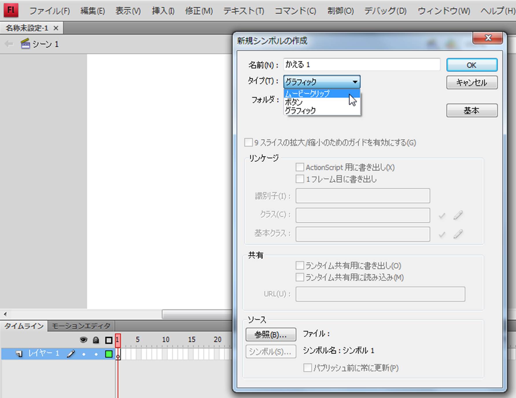 B. 新規シンボルの作成ウインドウで,名前(かえる1)とタイプ(ムービークリップ)をチェックし,OKボタンをクリックする.
