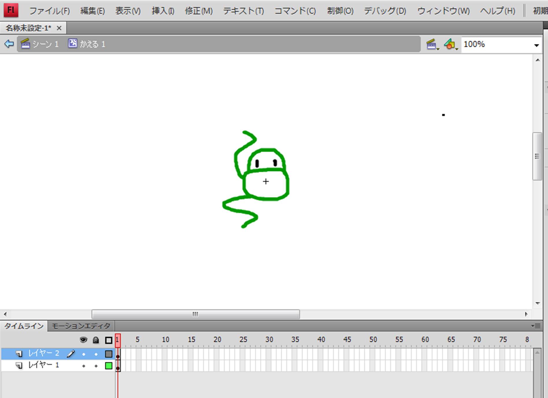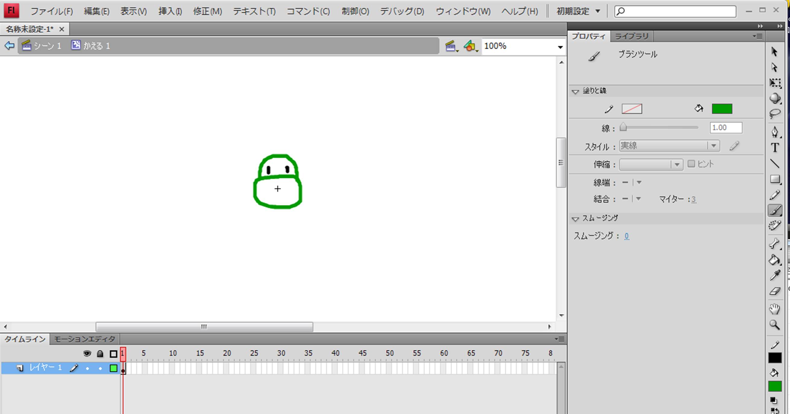 C. シンボルをあらわすフレームとして「かえる1」が左上に,「シーン1」の横に表示されている状態で,ブラシツールを用いて絵を書いていく.