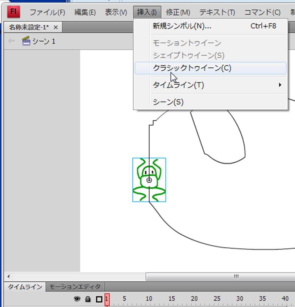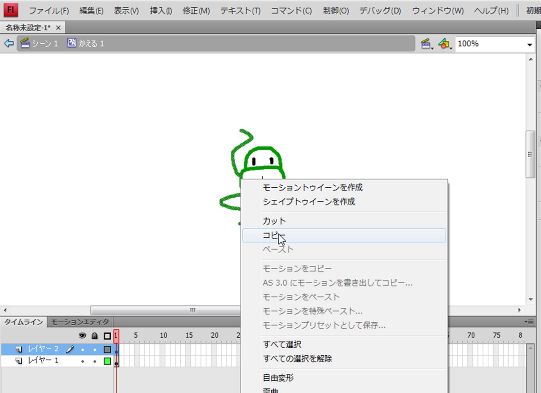 D1. レイヤー1の1フレームを選択し,クラシックトゥイーンを作成します.