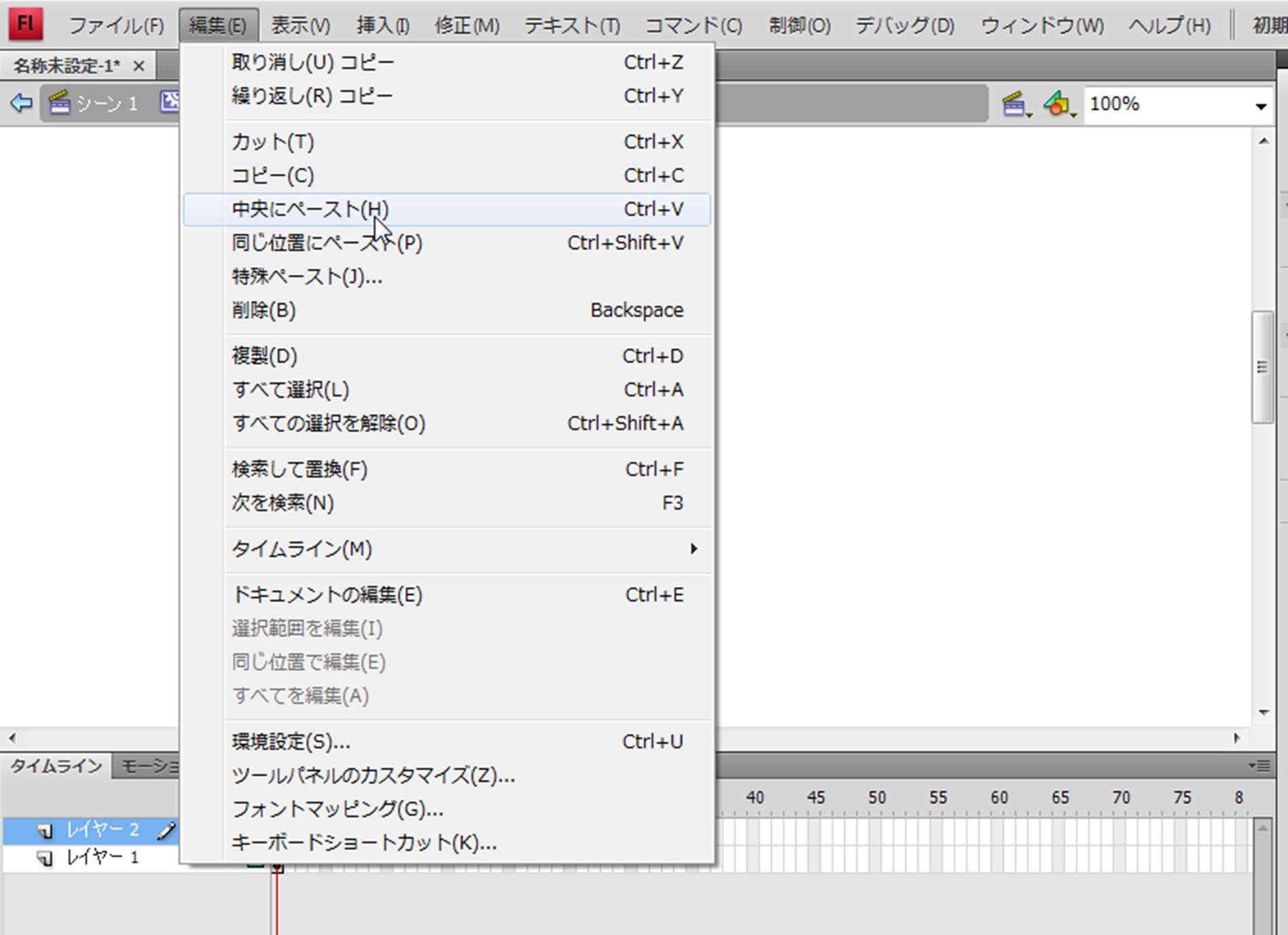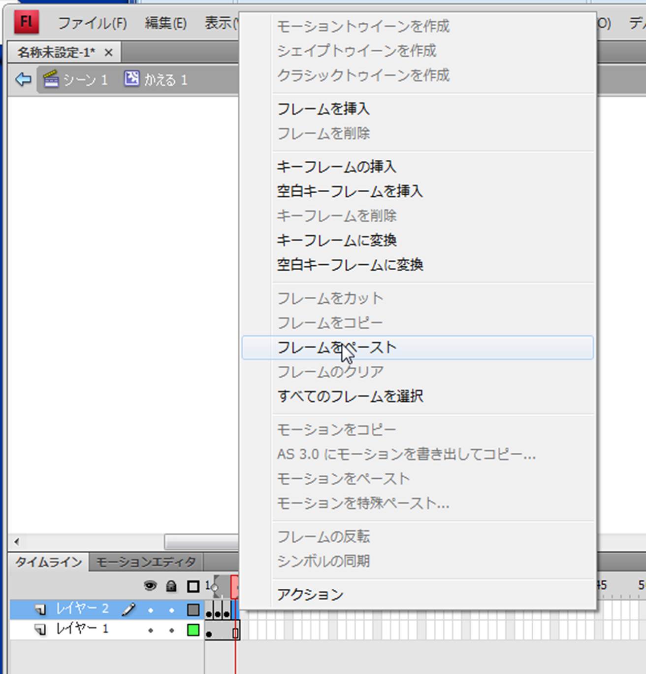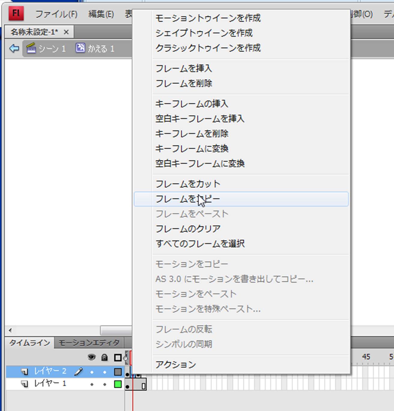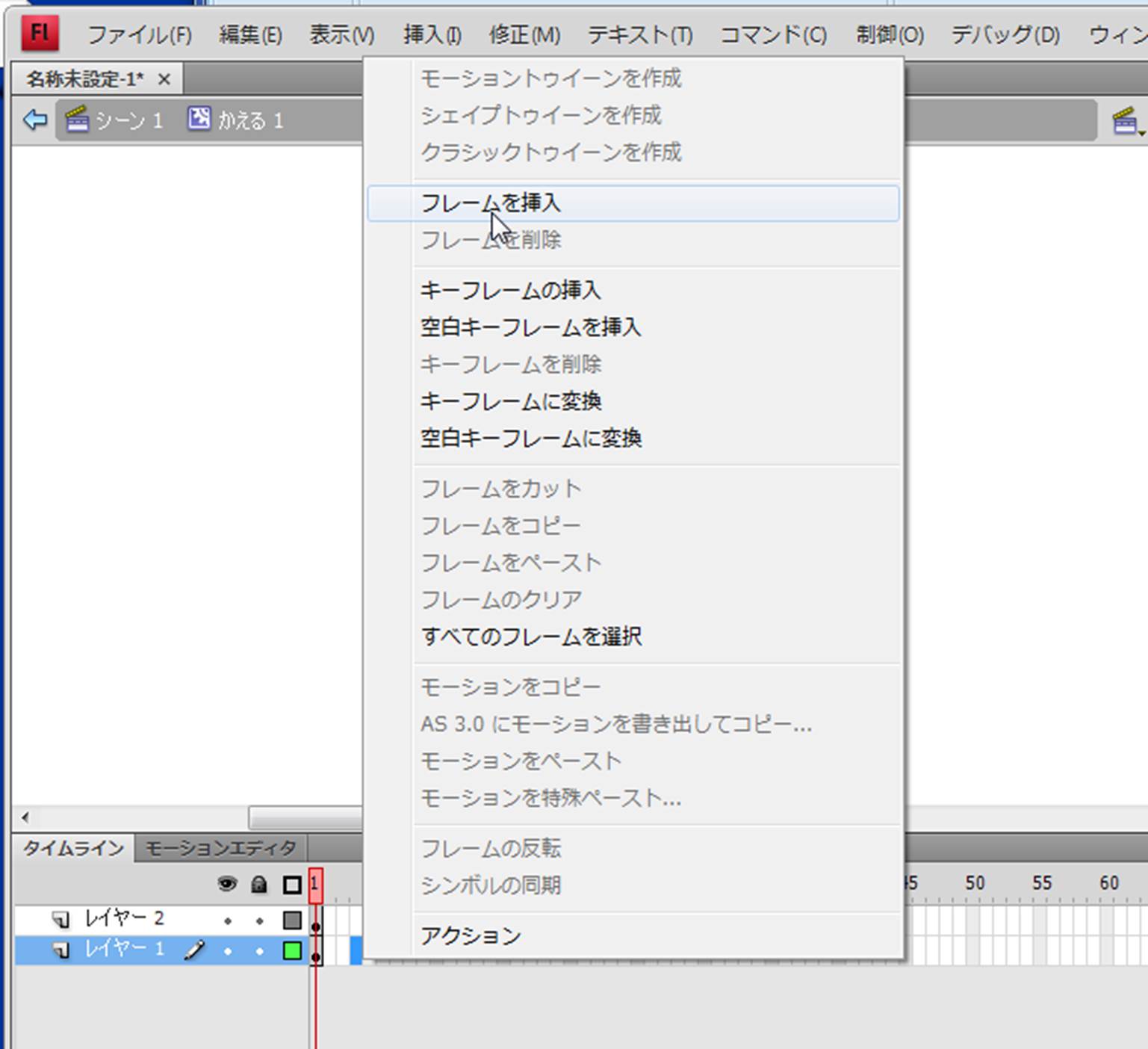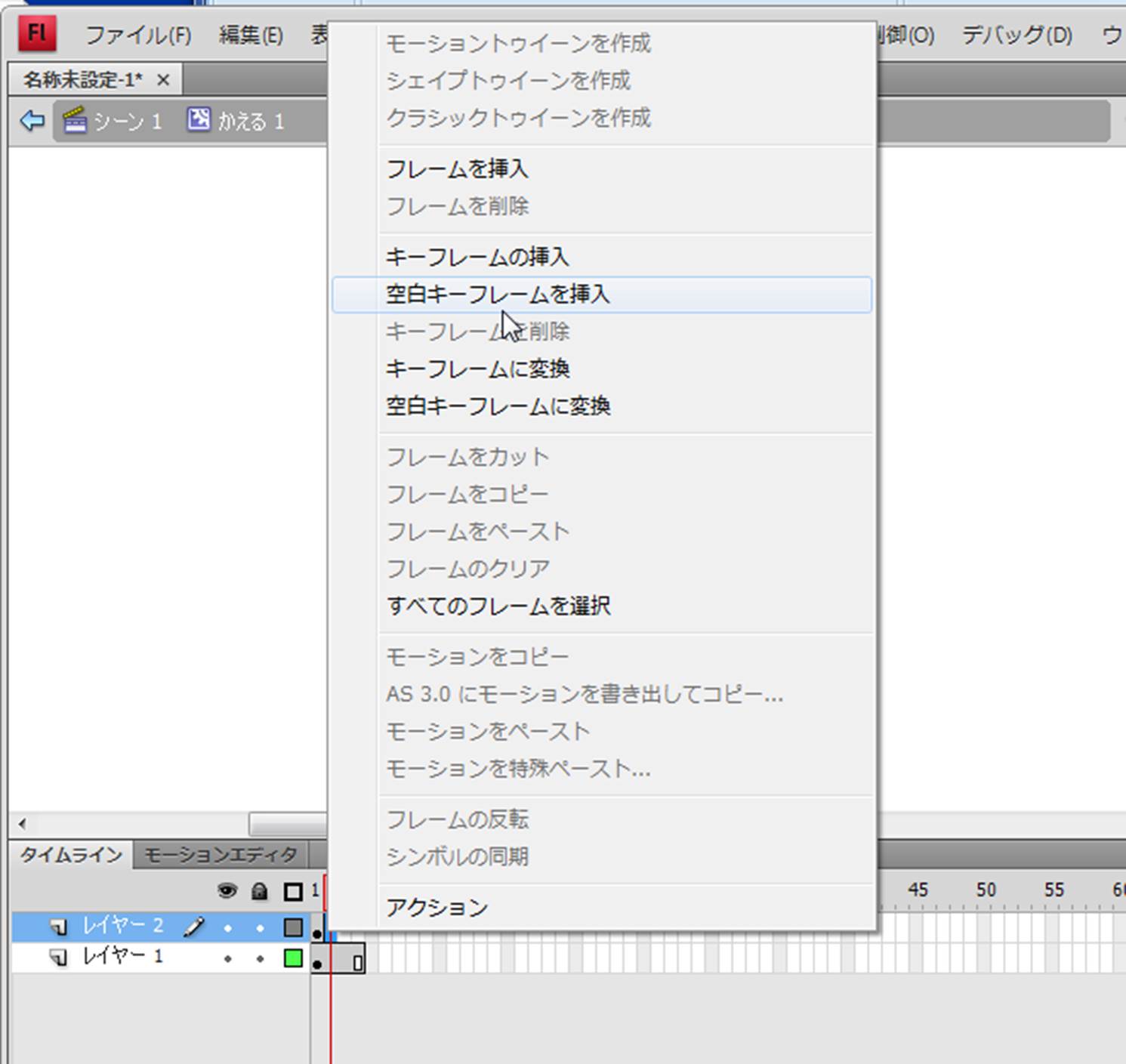 L. タイムラインウインドウでレイヤー2の2フレーム目を選択し,マウスの右ボタンを押して,空白のキーフレームを挿入します.
