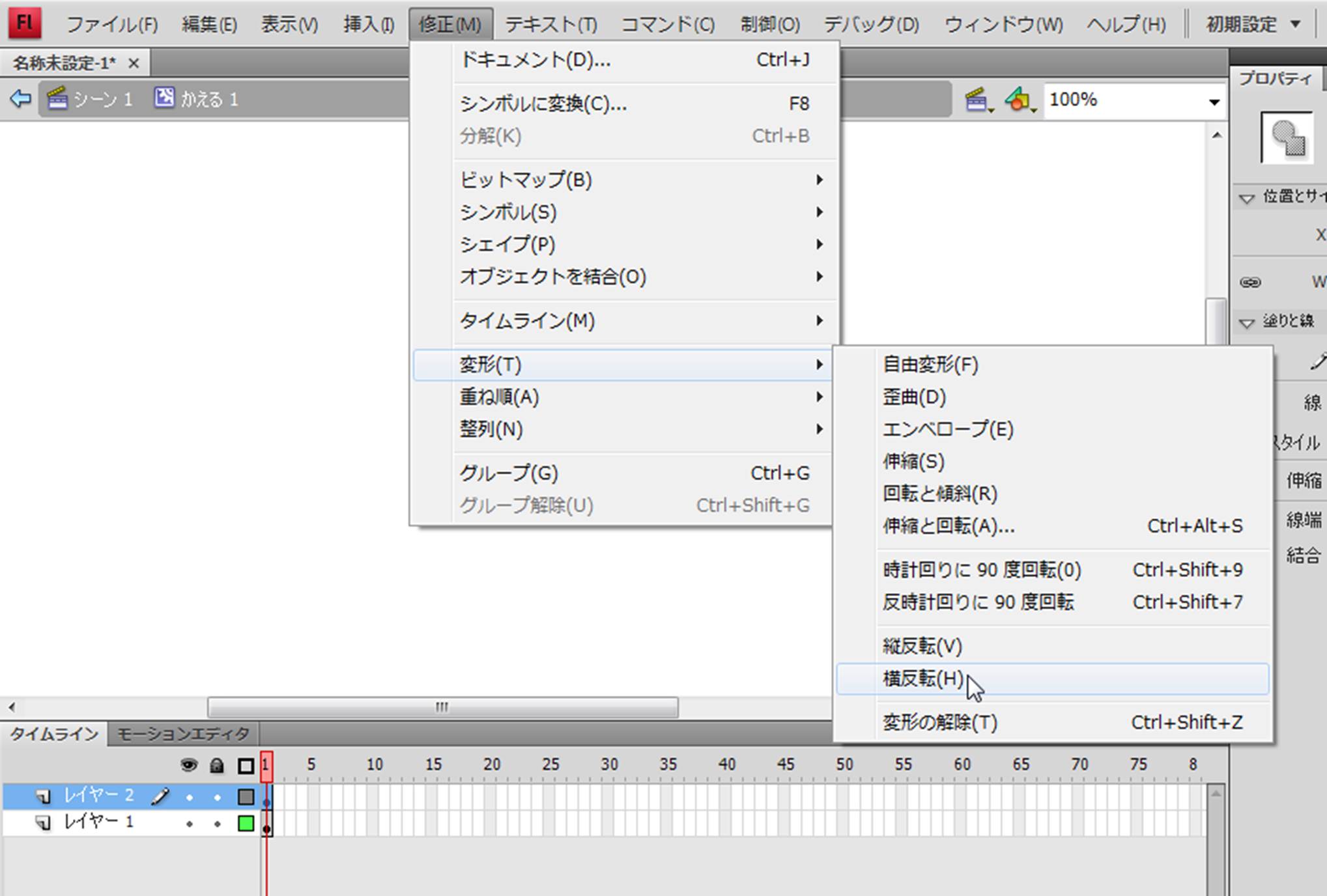 H. ペーストした左の手足は,向きが違うので,メニューバーの「修正」の中の「変形」の下の「横反転」を使って,右の手足になるように向きを修正します.