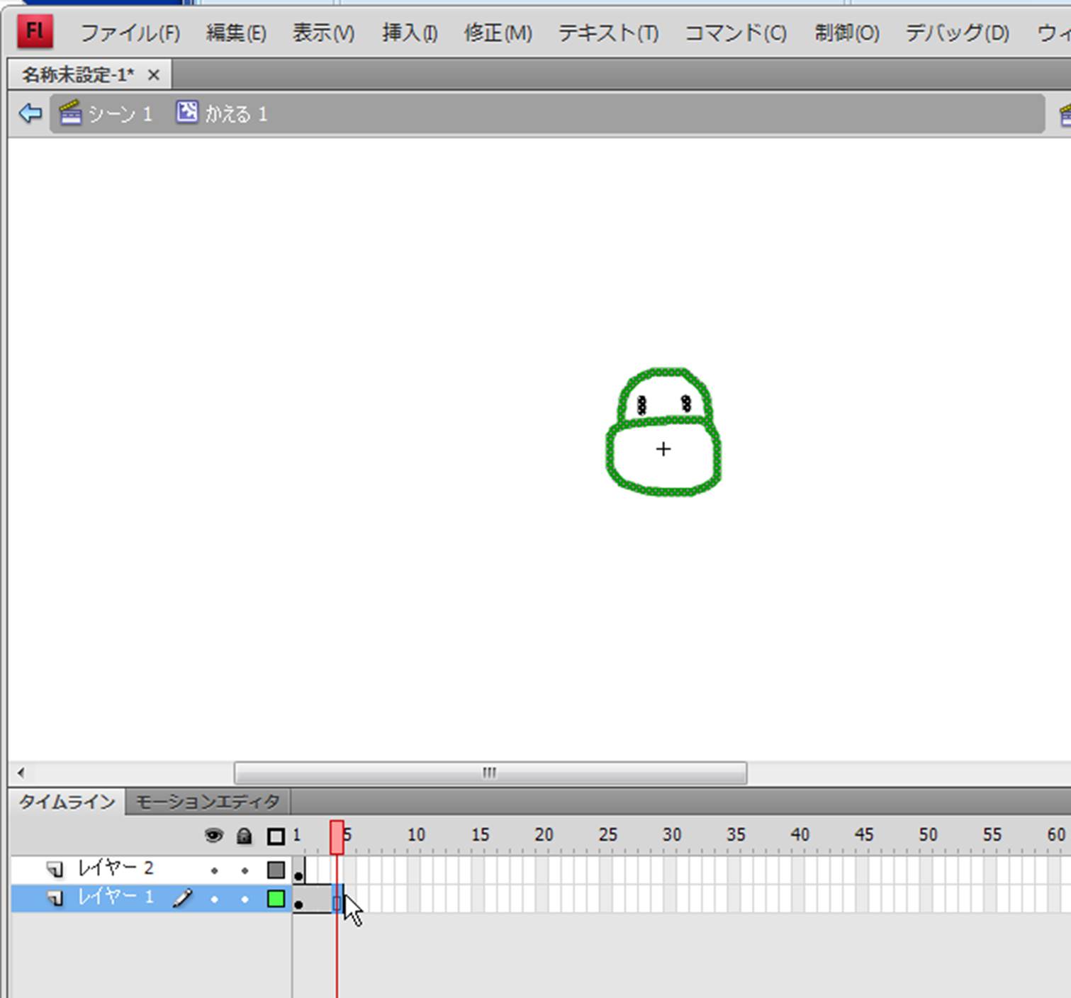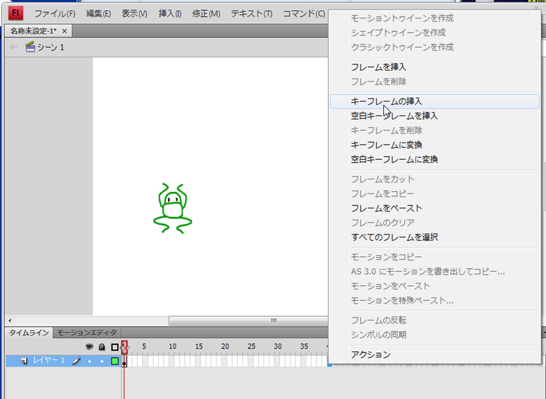 タイムラインウインドウのレイヤー1の4フレームを選択し,マウスの右ボタンを押して,フレームの挿入を行います.