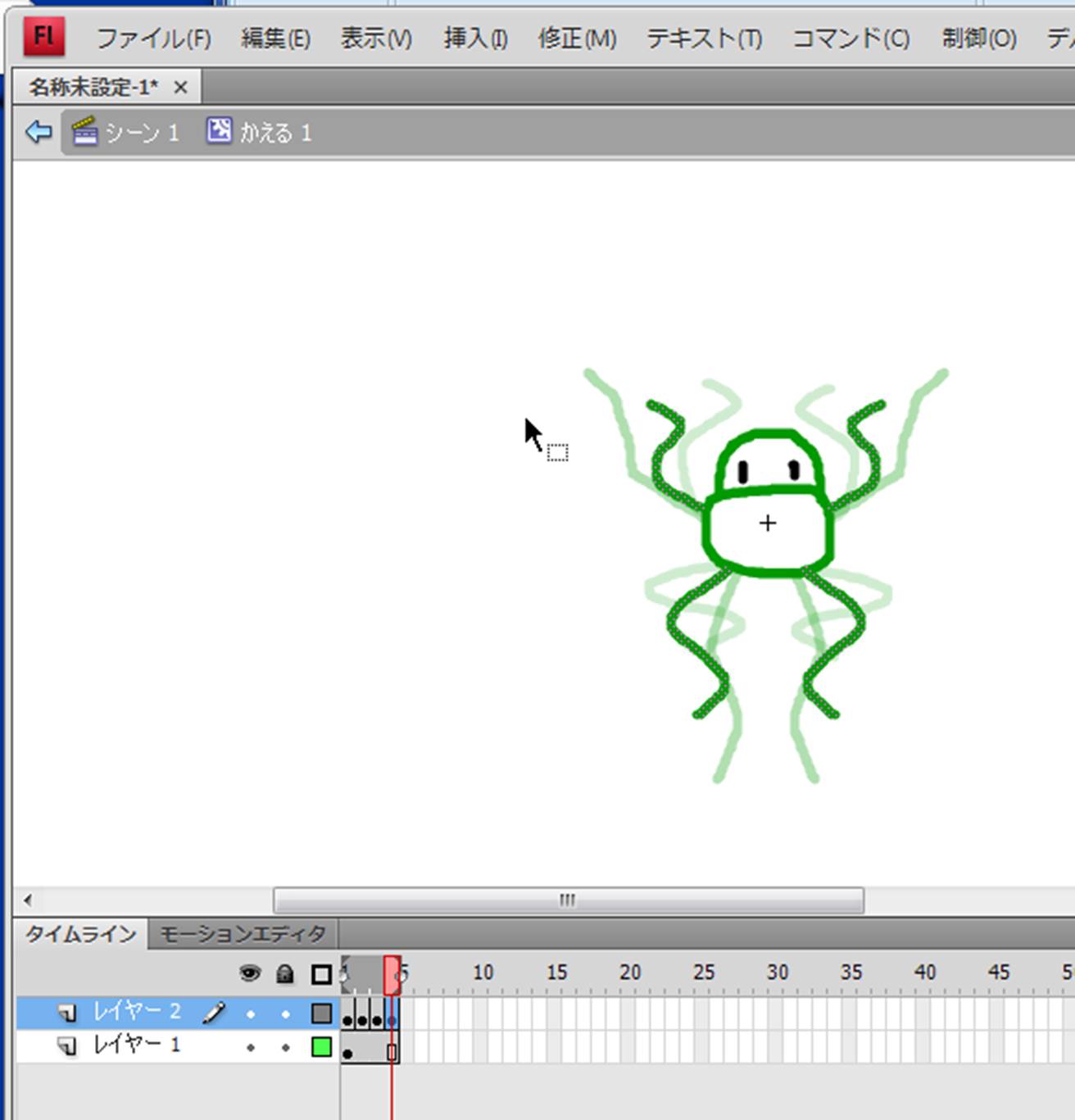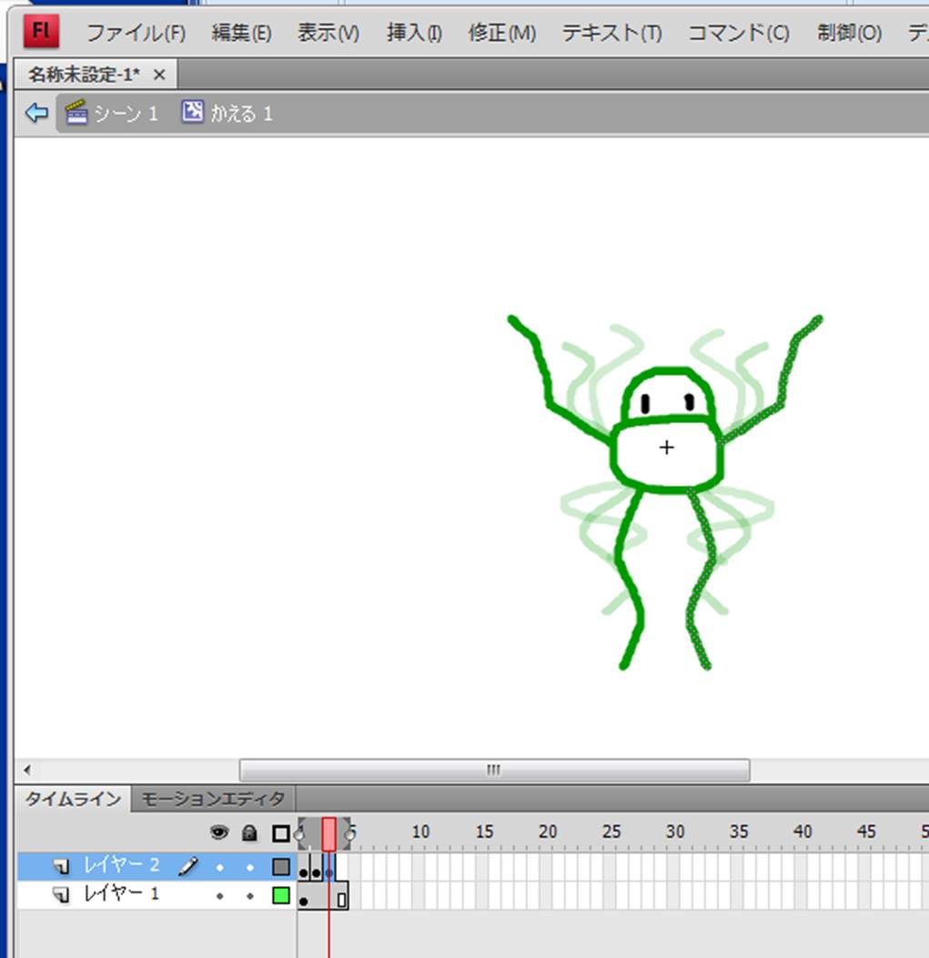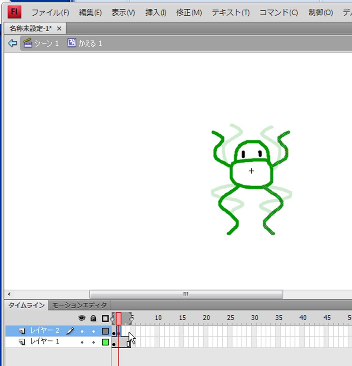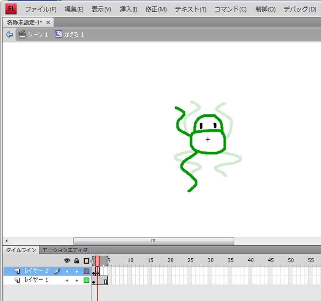 4)レイヤー2の2フレーム,3フレームに,「かえる」が泳ぐように手足の動きを描いていきます.