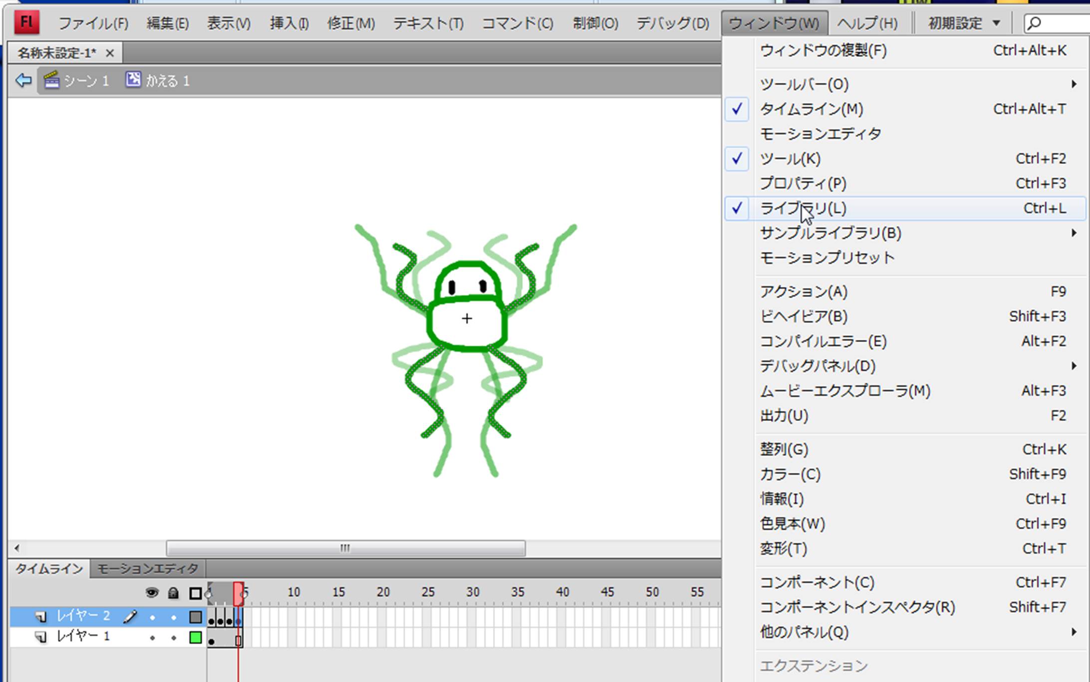 R. 今回作成したものは,シンボルとして,「かえる」の泳ぎを作成しています.これは,ライブラリの中に入っていますので,ライブラリをウインドウから開いて見ましょう.メニューバーの「ウインドウ」の「ライブラリ」選択します.