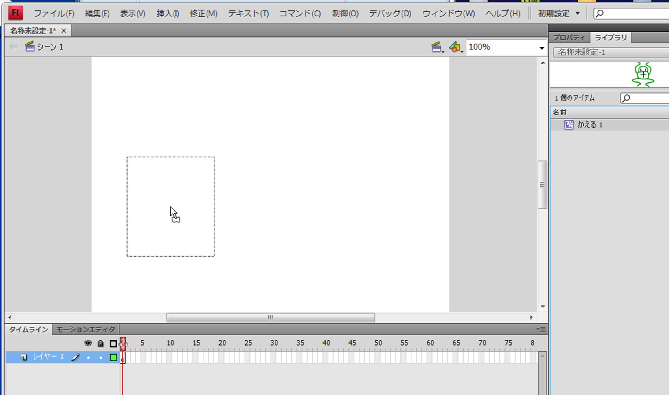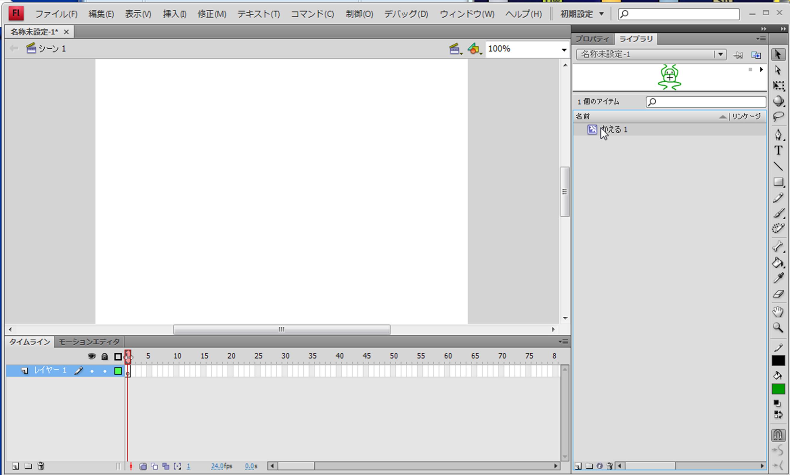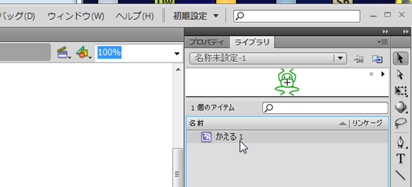 S. 画面の右にライブラリウインドウが表示されたと思います.名前のリストにある「かえる1」を選択し.シンボルを呼び出します.右上のボタンは,ムービークリップの再生ボタンですから,クリックしてみましょう.