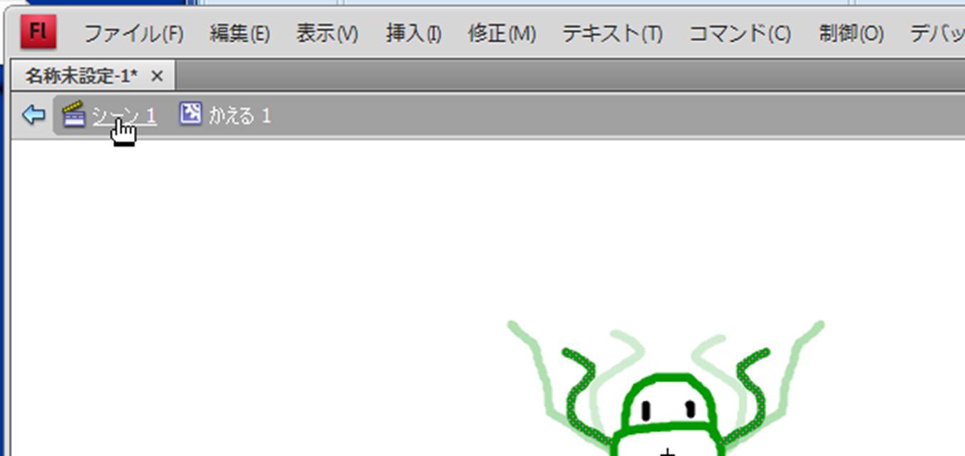 T. シンボルのフレームウインドウからアニメーションを作成するための「シーン1」のフレームウインドウに切り替えます.左上の「シーン1」をクリックします.