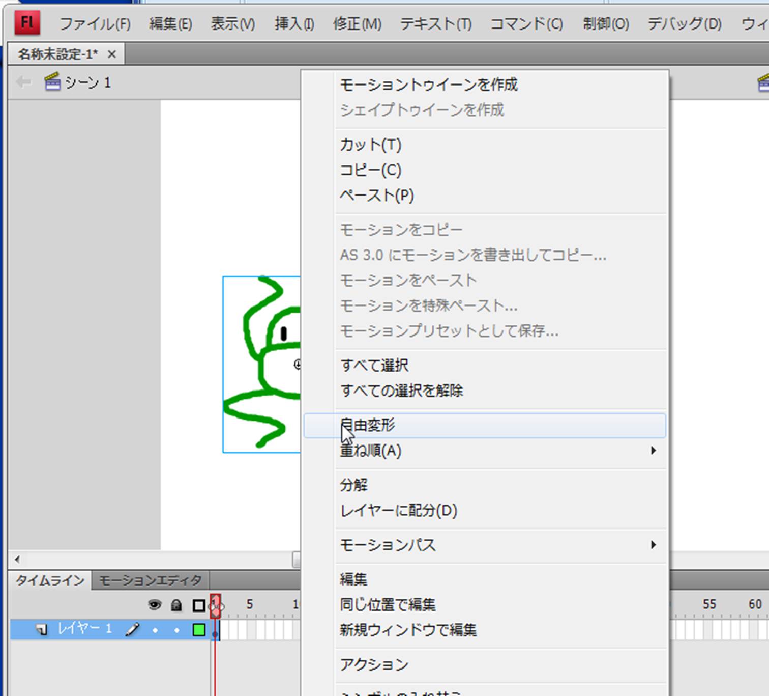 W. このシンボルの大きさを調整し,適当な大きさにします.フレーム上の絵の上でマウスの右ボタンをクリックし,プルダウンのメニューから「自由変形」を選択します.
