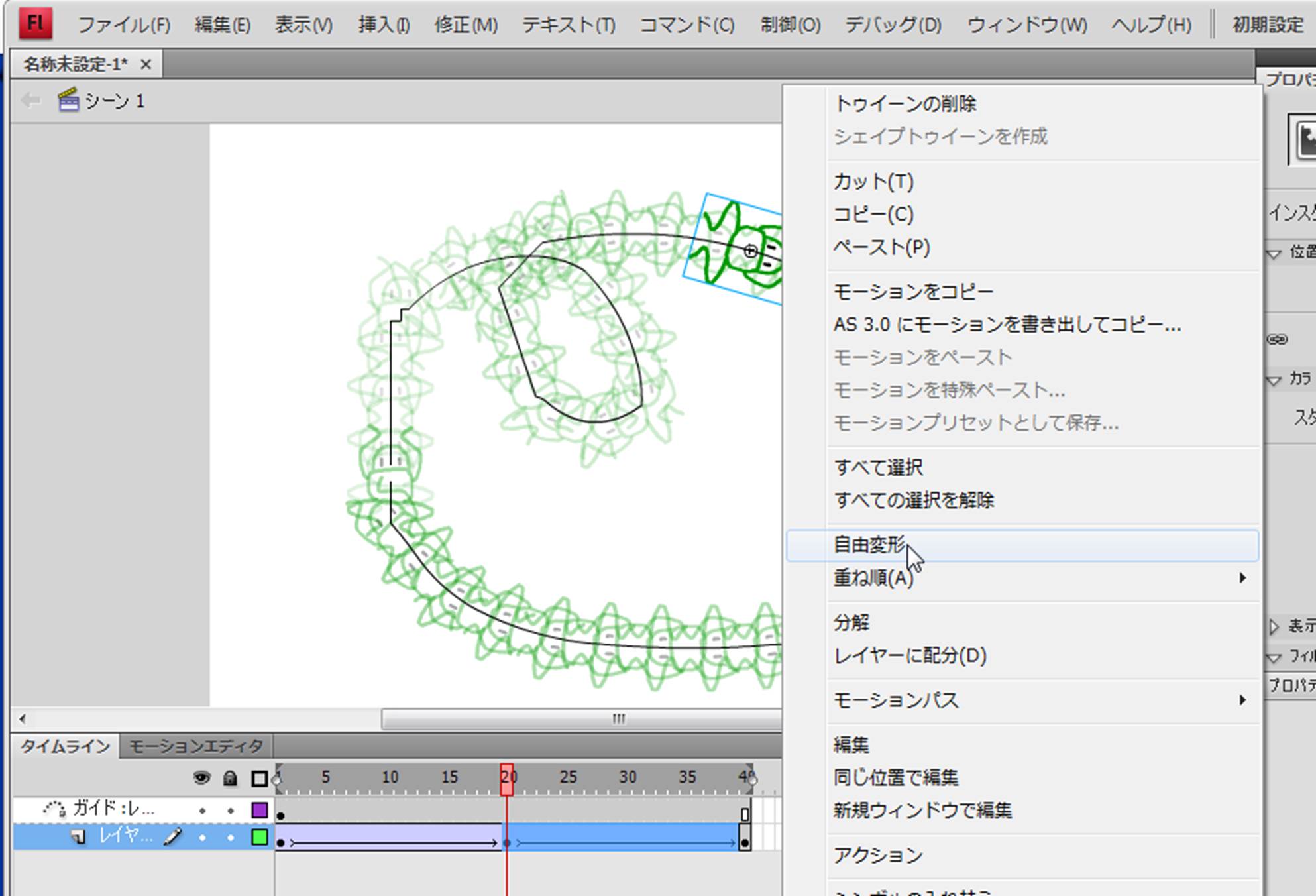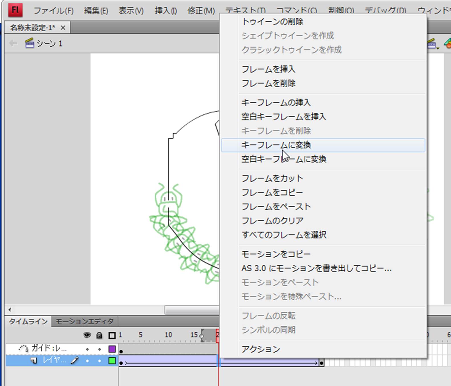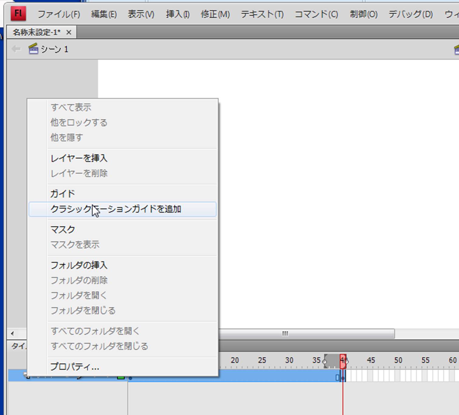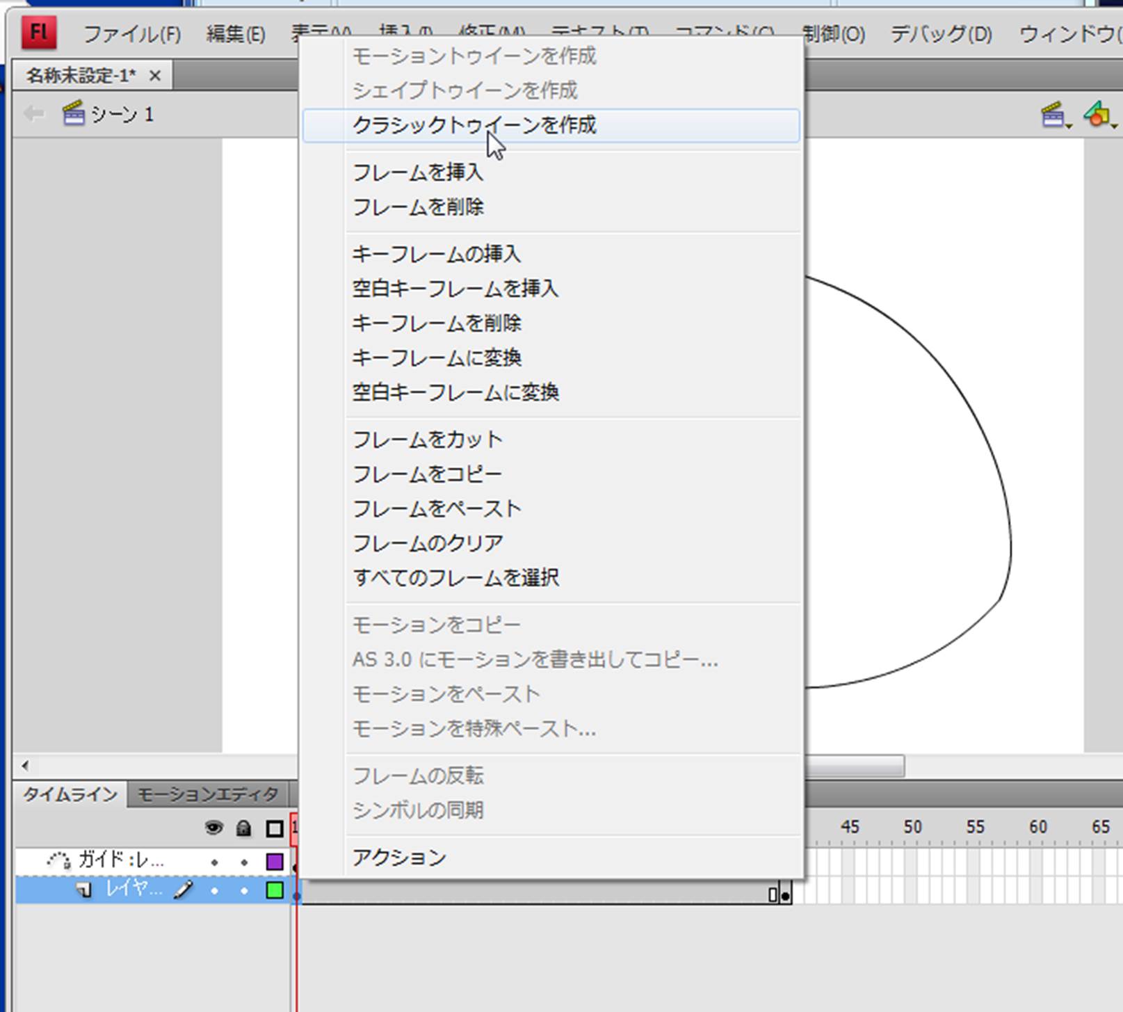 Z. タイムラインのウインドウ上のレイヤー1の表示部分を左クリックして,プルアップのメニューを表示させ,「クラシックモーションガイドを追加」を選択し,レイヤー1のモーションガイドを追加します.