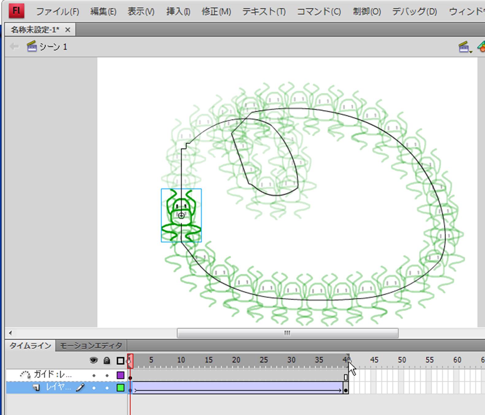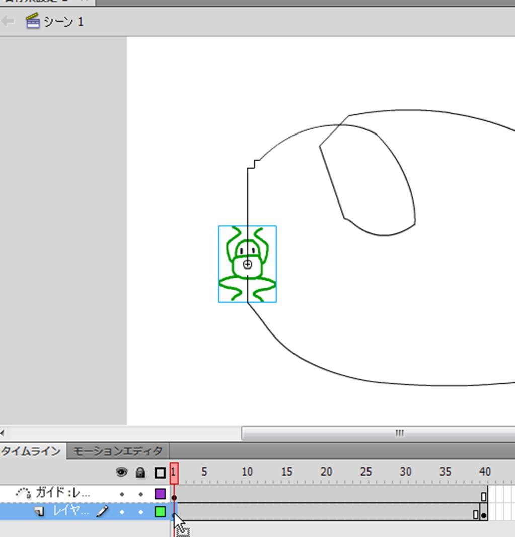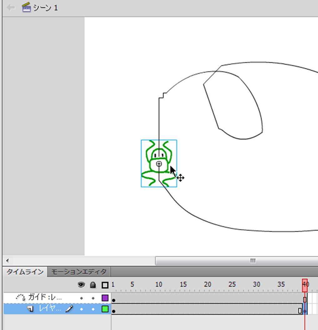 C1. ガイドラインのパスの始点に1フレームの絵の位置と,終点に40フレームの絵の位置を配置します.
