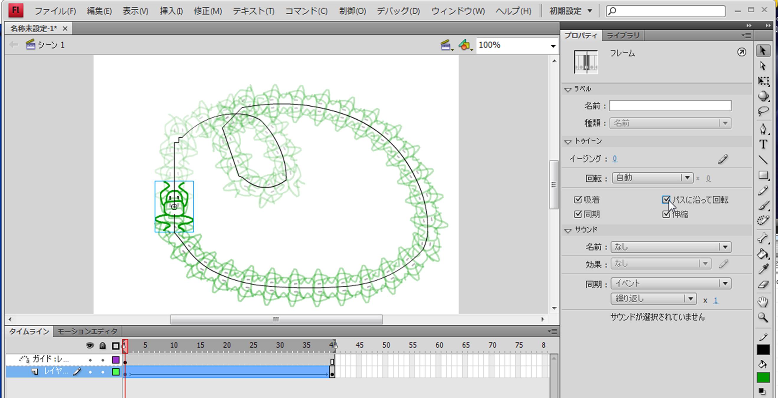 F1. 1フレームのモーショントゥイーンの設定で,プロパティウインドウで,「パスに沿って回転」をチェックします.ここでもパスに沿った動きを確認しましょう.