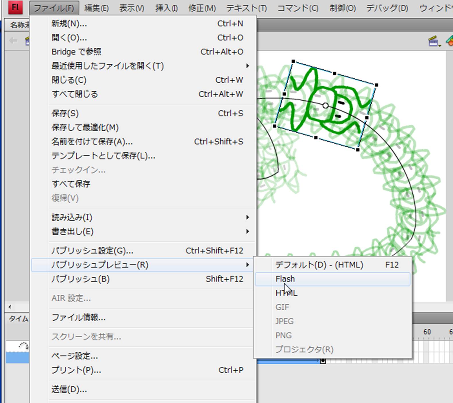 I1. メニューバーの「ファイル」の中の「パブリッシュプレビュー」の「Flash」を選択します.ウィンドウが開いて,プレビューを見ることができます.
