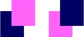※後退色が手前に重なっているように見える右図よりも、進出色が手前に重なっているように見える左図の方が手前に飛び出しているように見えるかと思います。右図は後退色の後に空間があるように見えるかと思います。