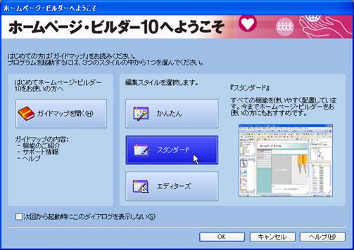 1. 起動時に以下のようなウインドウが表示されましたら,編集スタイルは,「スタンダード」を選択し,OKをクリックします.ホームページ・ビルダー22では、ファイルメニューの「フレーム設定の新規作成」を選択して、4.で示すウィザードのウインドウにいきます。