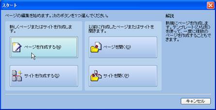 2. ボームページ・ビルダーの初期画面が表示されましたら,新規にページを作成していくことになるため,ツールバーの「スタート」をクリックし,スタートのウインドウから,「ページを作成する」を選択します.さらにページ作成方法の選択では「白紙ページ」を選択する.