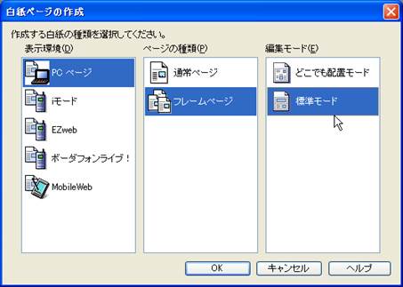 3. 白紙ページの作成のウインドウが表示されますので,下記の図のように「PCページ」,「フレームページ」,「標準モード」と選択してください.ここで,フレームを使用しない場合には,ページの種類を「通常ページ」にします.また,編集モードで,「どこでも配置モード」に設定すると,文字や図などの配置を自由におくことが可能です.