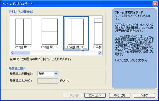 4. ページの作成ウイザードで,「フレームページ」を選択すると,以下のようなフレーム作成ウイザードのウインドウが表示されます.今回は,「2分割横−2」を選択し,次へをクリックし,フレームの選択は,そのままで,完了をクリックします.ホームページビルダー22では、最後のウィザードのウインドウでは、「標準モード」を選択します。