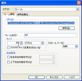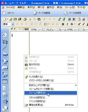5. 新規のフレーム構造のページが表示されましたら,目次となるフレームのページについて,フレーム幅の調整を行います.左のフレームをクリックし,マウスの右ボタンを押して,プルダウンのメニューから「フレームの属性」を選択します.属性のウインドウで,フレームサイズを調整します.ここでは,「200ピクセル」としています.