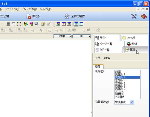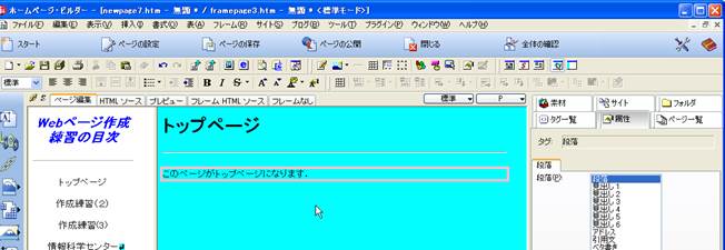 6. フレームの設定などが終了すると,いよいよ文字や画像などの入力となります.まず,目次となるフレーム側から入力していきましょう.ツールバーの「段落の挿入・変更」部分で,「見出し2」を選択し,文字を入力します.ここでは,「Webページ作成練習の目次」と入力します. 文字の配置は,ツールバーの「中央揃え」で変更します.入力した文字の属性は,ウインドウの左の属性部分で,確認できます.ホームページビルダー22では、「表示」メニューの「属性ビュー」を選択して右のウインドウで見えるようにします。