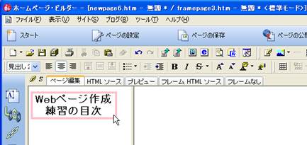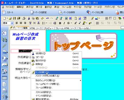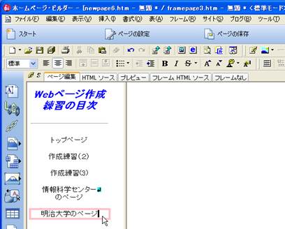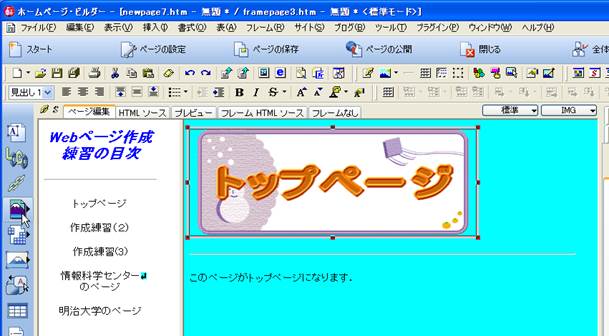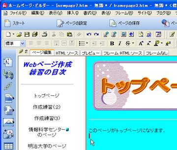 9. 目次となる文字を入力していきます.「標準」の入力で,「トップページ」,「作成練習(2)」,「作成練習(3)」,「情報科学センターのページ」,「明治大学のページ」をそれぞれ,改行で続けずに,カーソルを移動させて入力してください.