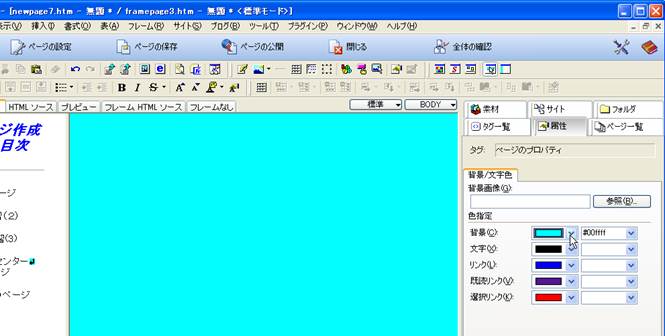 10. 目次の部分(左側)のそれぞれにリンクを張っていく前に,右側のトップページを作成しておきます.ここでは,ページの背景の色を変更してみましょう.右のフレーム内を選択し,属性から,背景を設定します.ここで,画像を用いることも可能です.