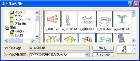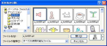 13. トップページに画像を挿入してみましょう.「このページがトップページになります.」の文字の下にカーソルを移動し,「ナビメニュー」から「画像ファイルの挿入」で,「素材集から」を選択します.当然ファイルからも入力できますし,ドラッグアンドドロップで,ファイルを画面上に直接入れ込むことも可能です.画像集の適当な画像を挿入してみましょう.ホームページビルダー22では、「画像や画像の挿入」となっており、中身も異なります。「フレーム設定の新規作成」を選択して、4.で示すウィザードのウインドウにいきます。